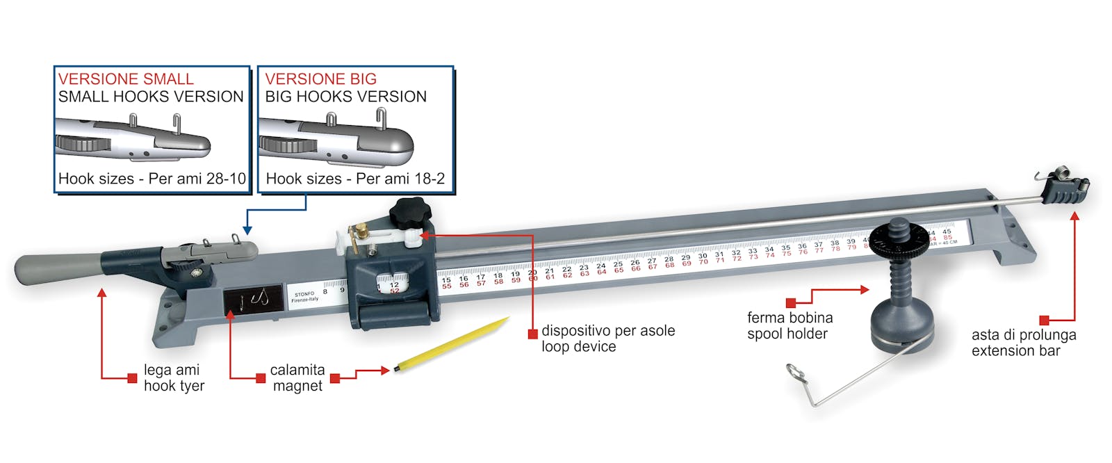 Hooklengths tyer precision machine. The Calibrone permits to tie hooklengths from 10 cm to as long as you desire easily, and it has also a loop tyer device for tying small loops. Available in two versions for small and big hooks. Inches scale version is available on request. Supplied with spool holder for a perfect line tension, extension bar, magnetic pen for hooks and instructions for use.