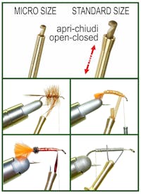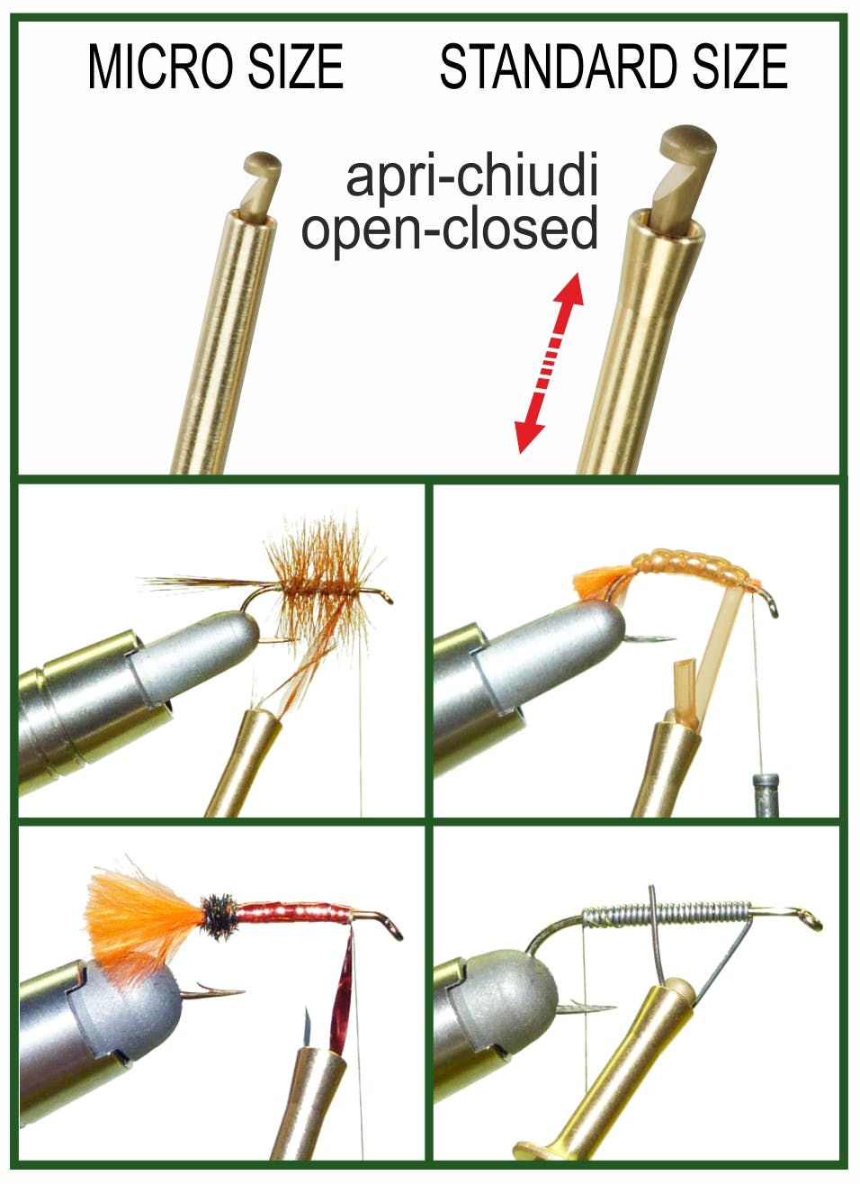 A new-concept hackle pliers. Permit a very good tightening of every kind of material like cock hackles, cul de canard, microchenille, tinsel, lead wire etc. etc. The micro size is suitable for small hooks 14-24 , the standard size for bigger hooks 16-4/0.
