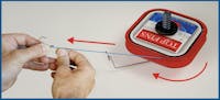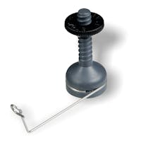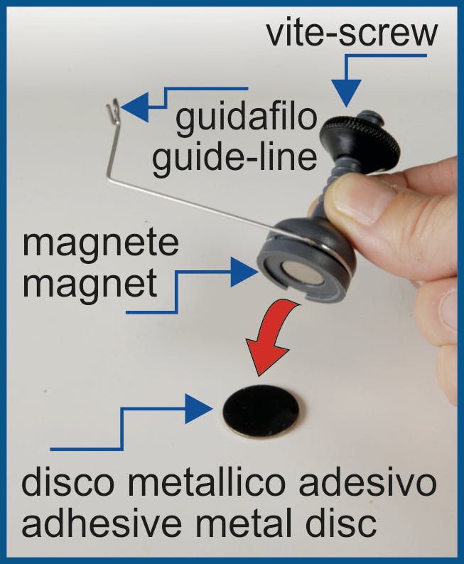 Spool holder device with magnetic drag for a perfect line tension. Useful to tie hooks easily and make various types of rigs. Supplied with stainless steel guide-line and two adhesive metal discs.