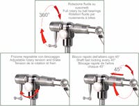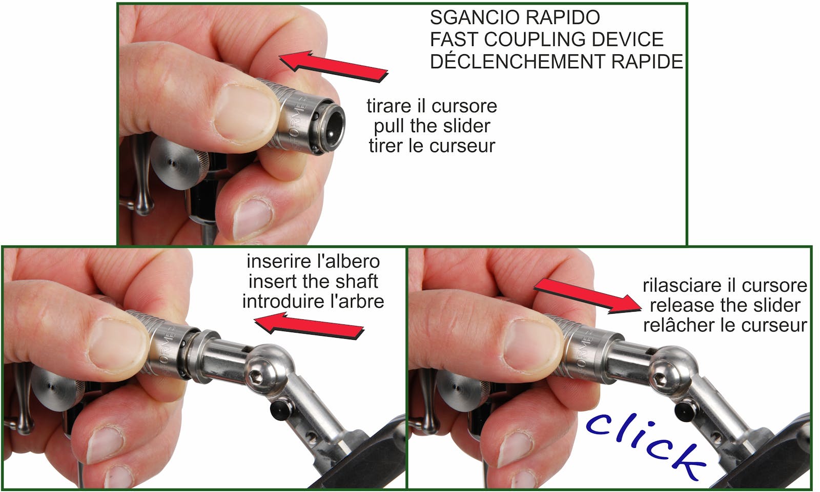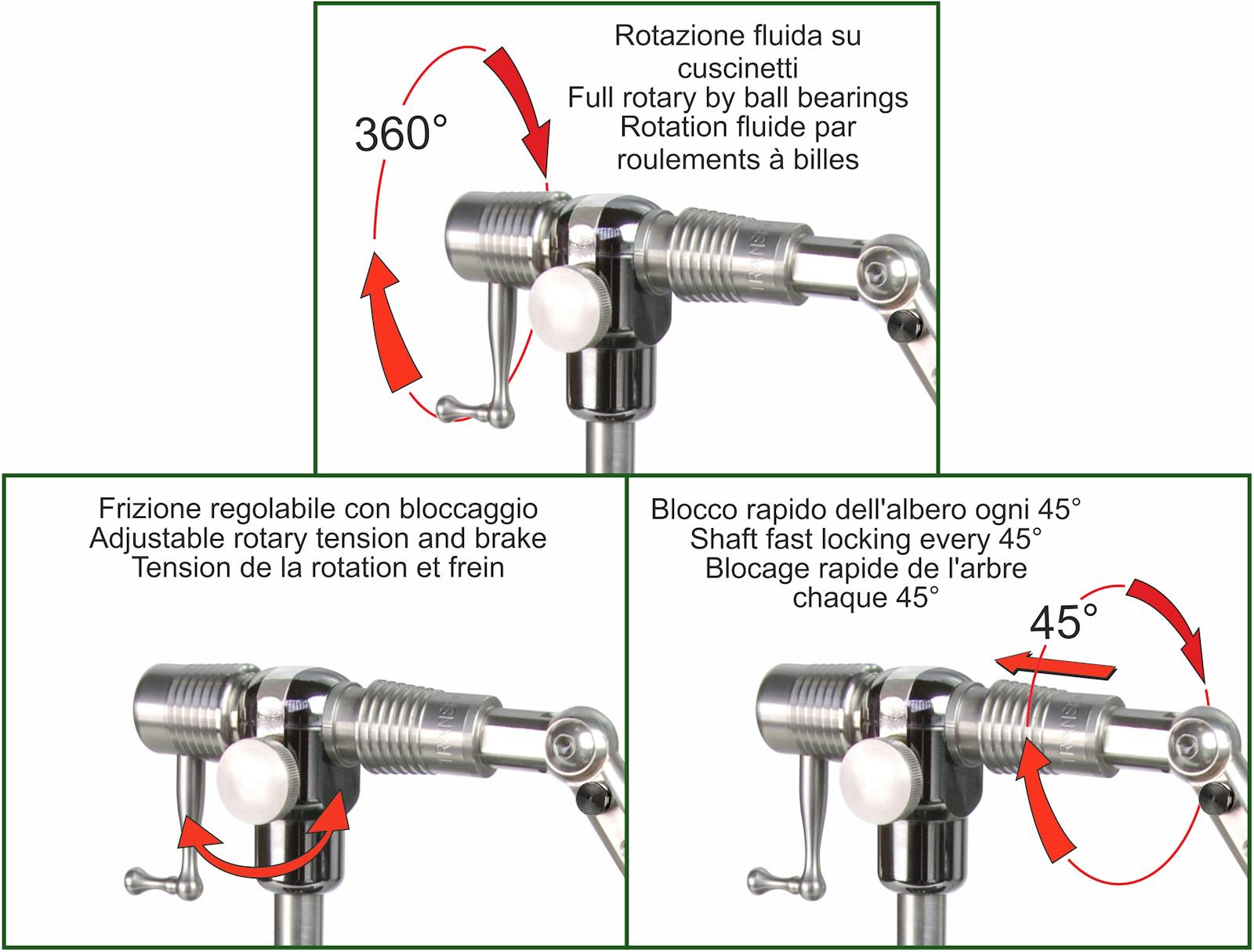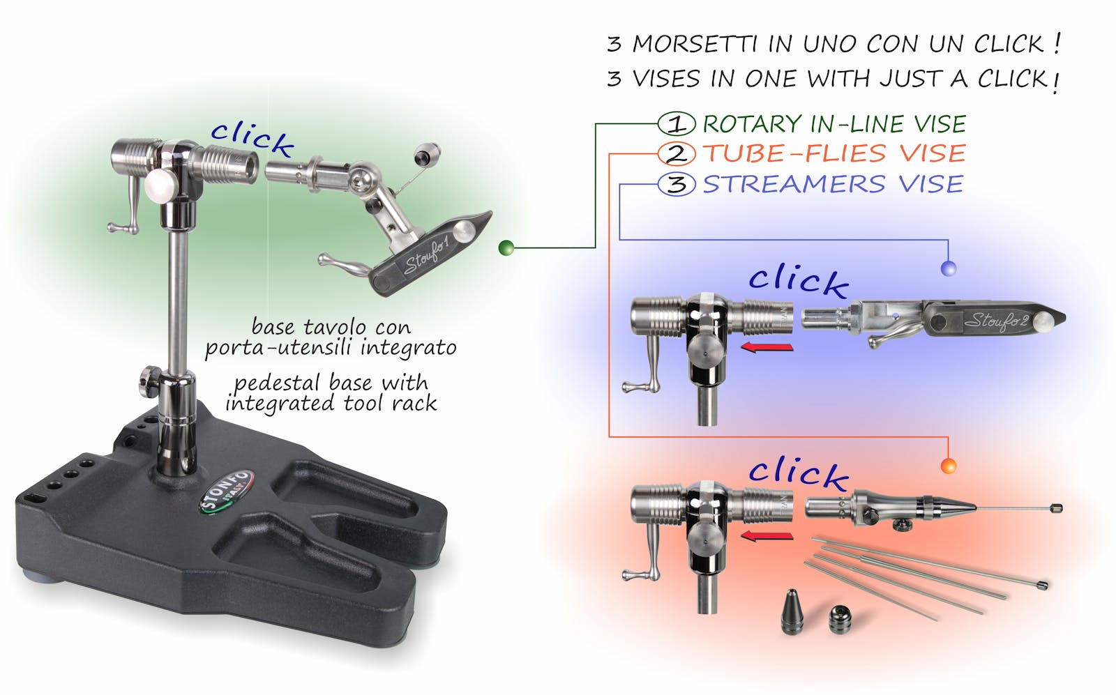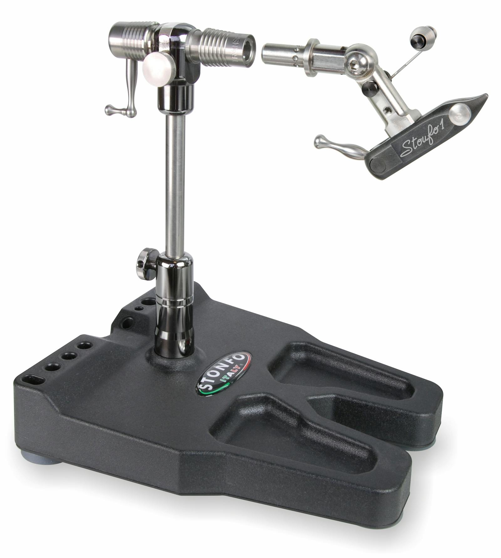 The Transformer is a high quality product that thanks to a fast coupling device on the shaft can be transformed from in-line vise to tube-fly vise or streamer vise. Three vises in one with just a click. The stainless steel shaft is in-line full rotary by dual precision ball bearings. All parts of three vises are included with Transformer. The steady pedestal base has a useful integrated tool rack and connection for magnifying glass item 642 (tools and magnifying glass not included). Other important Transformer features: interchangeable jaws, adjustable rotary tension, smooth rotary motion, locking position at any angle, shaft fast locking every 45° angle, adjustable height, reversible for left hand tying. Other accessories included: rounded shape bobbin cradle, parachute plier, adjustable spring material clip, pivot thread cradle, allen keys and instruction manual.