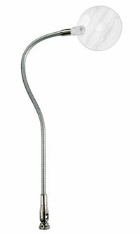 Lente d'ingrandimento appositamente studiata per l'utilizzo su morsetti, consente di vedere chiaramente e senza distorsioni piccoli particolari durante il montaggio, senza impegnare le mani. E' munita di braccio flessibile regolabile in ogni posizione con all’estremità un attacco di piccole dimensioni che permette un facile e stabile bloccaggio su morsetti con asta da Ø 8 a 10 mm (3/8") e su aste porta-accessori di Ø 5 mm. Dati tecnici: ingrandimento 2X, dimensioni lente 80 mm, lunghezza braccio flessibile 350 mm, peso gr 170. Non è adatta per l'incastro nel TOOL BAR (art. 692), nel porta-utensili integrato della BASE TRR (art. 657), della base del MORSETTO ELITE (art. 653) e della base del MORSETTO TRANSFORMER (art. 654).