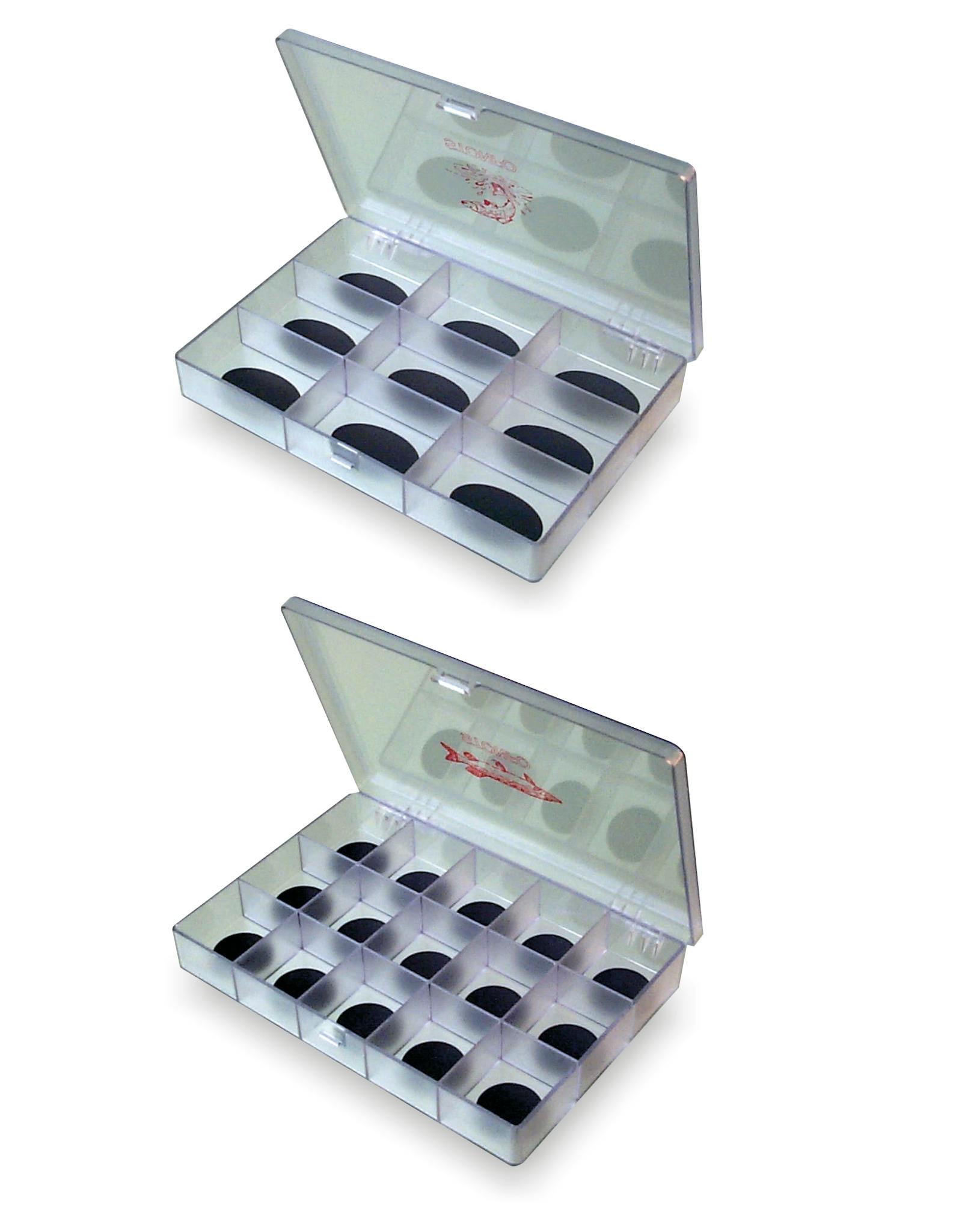 Scatole anti-urto, leggere, trasparenti, munite di dischi magnetici in ogni scomparto.