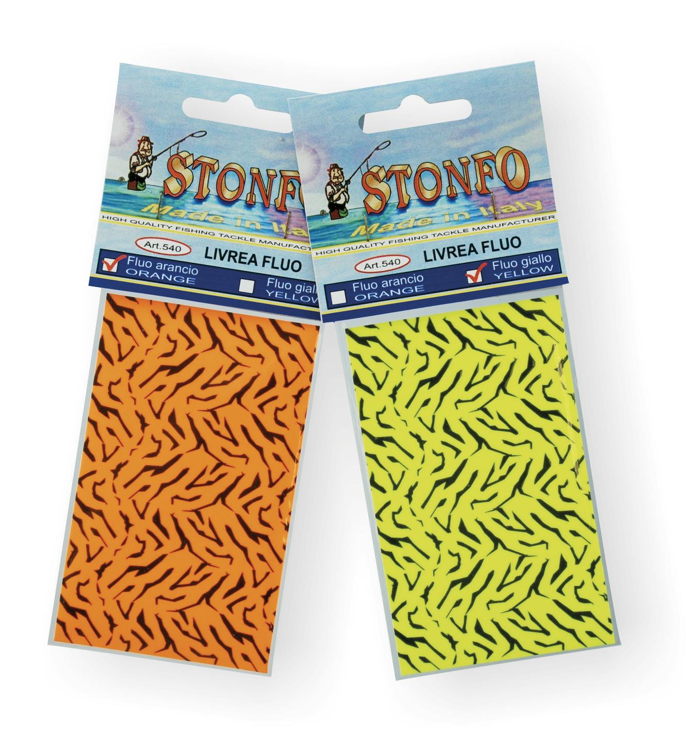 Disegno decorativo stampato in rilievo su supporto fluorescente adesivo utile per la personalizzazione di esche artificiali.