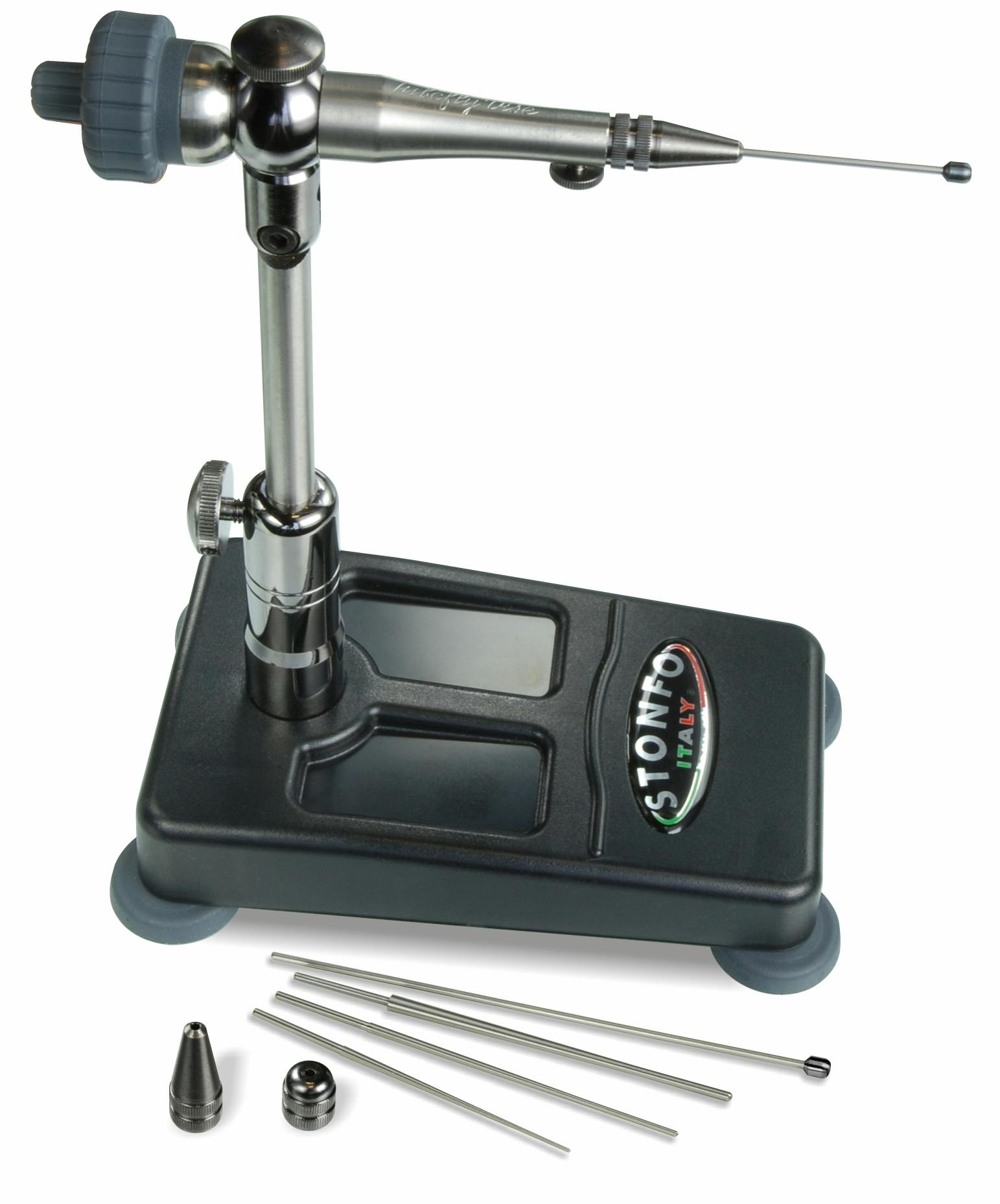 Morsetto speciale di alta precisione realizzato espressamente per il montaggio delle tubeflies. Il gruppo testa, dalla forma affusolata ergonomica, è montato su due cuscinetti di precisione che ne consentono una rapida rotazione in asse a 360° agevolata ulteriormente dallo speciale volantino a doppio diametro. Le astine in acciaio inox in dotazione al morsetto, 3 coniche e 2 cilindriche con blocco terminale, sono finemente lavorate su macchine cnc e permettono di serrare sul morsetto una grande varietà di tubetti.
