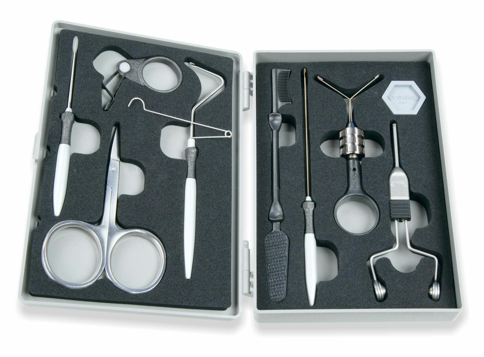 Set da viaggio completo di 8 utensili per la costruzione di mosche artificiali e streamers. Fornito in una robusta ed elegante scatolina il cui interno in gomma è sagomato per dare ad ogni utensile un preciso alloggiamento. Il set comprende: Forbicine, bobinatore Bobtec1 con tensionamento del filo regolabile, Passafilo, Annodatore-Annodatore conico, Spillo di montaggio, Pinza per hackles, Rotodubbing mini, Pettine Comb. All’interno dettagliate istruzioni per l’uso dei vari utensili.