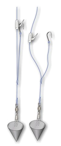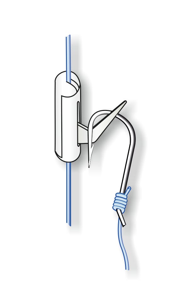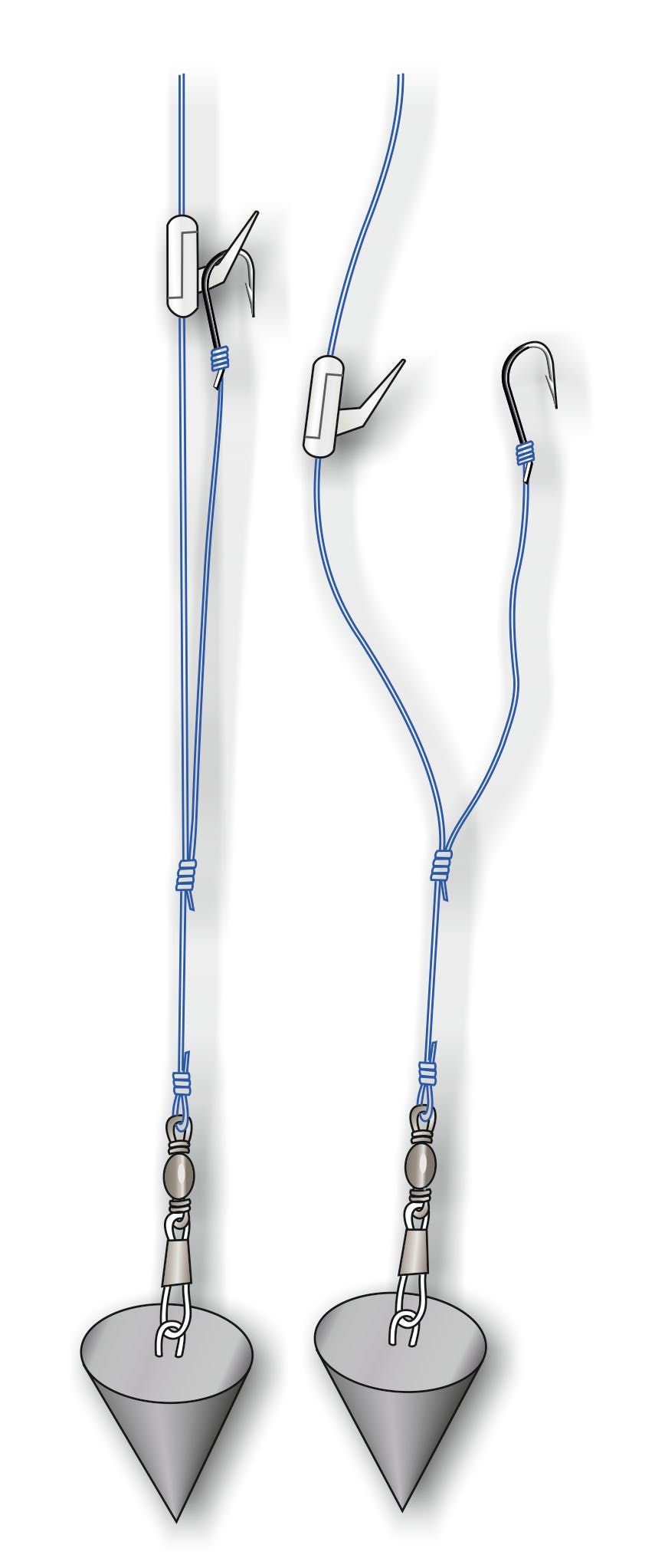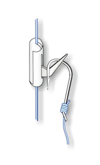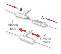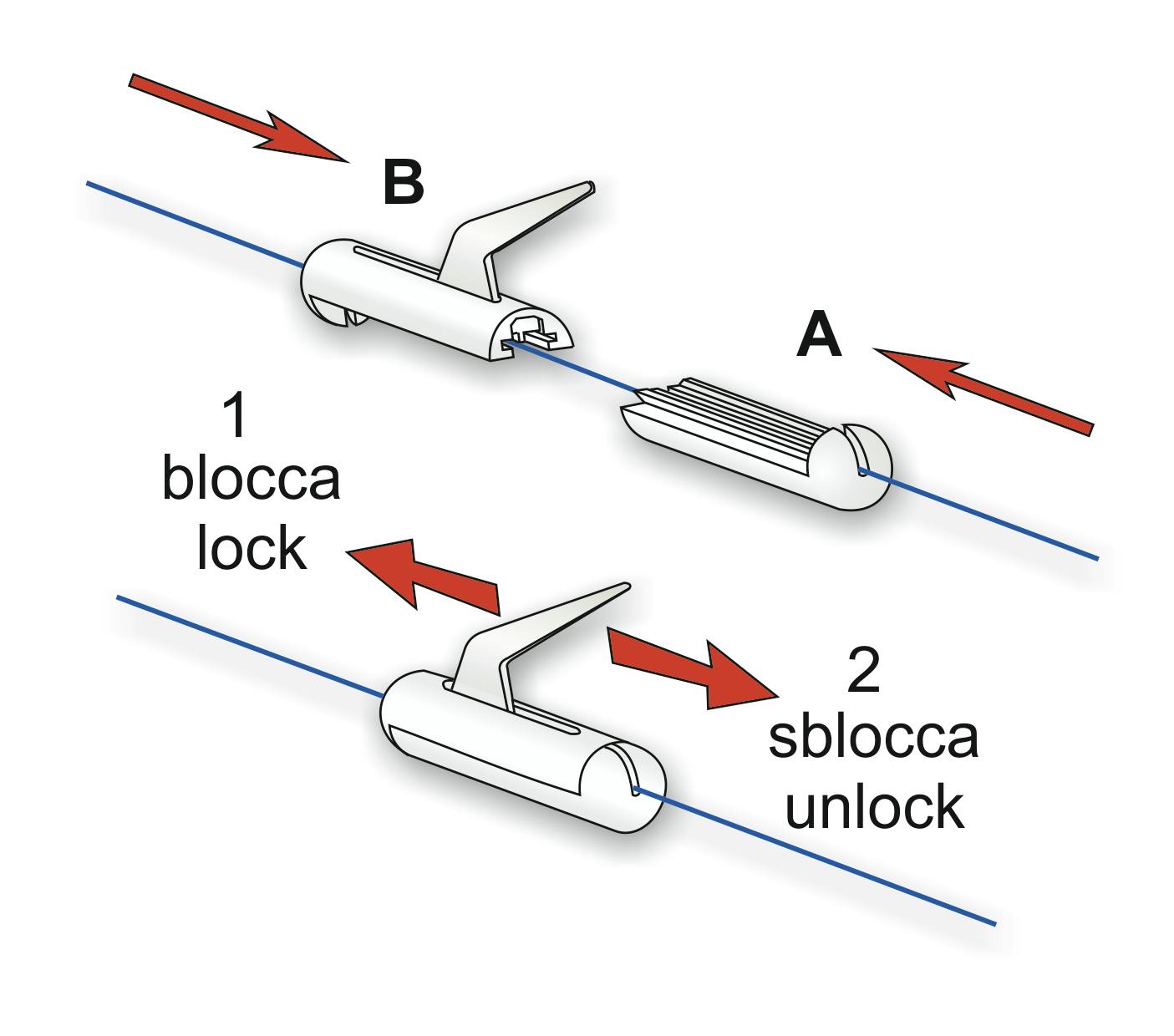 Bait clip, device to secure bait during cast. Instructions: introduce the line in piece "A" groove and, keeping the line taut, insert piece "A" slide into piece "B" way, with the clip in position "2". Move the clip to position "1" to lock the bait clip in the desired position. Available in 3 sizes.