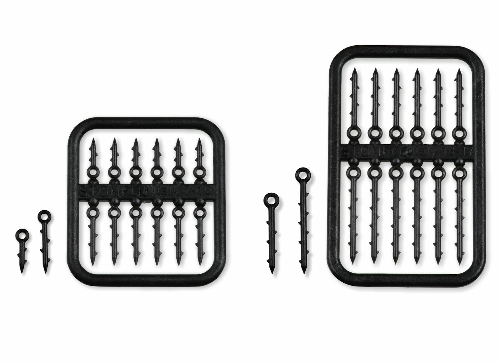 Pins in rigid plastic material, can be inserted into soft boilies, pellets, corn, silicone baits etc. allowing them to be fixed directly to the hair rig. Thanks to their lightweight are perfect even for floating baits. The barbs in both sides ensure a better bait holding.