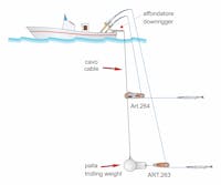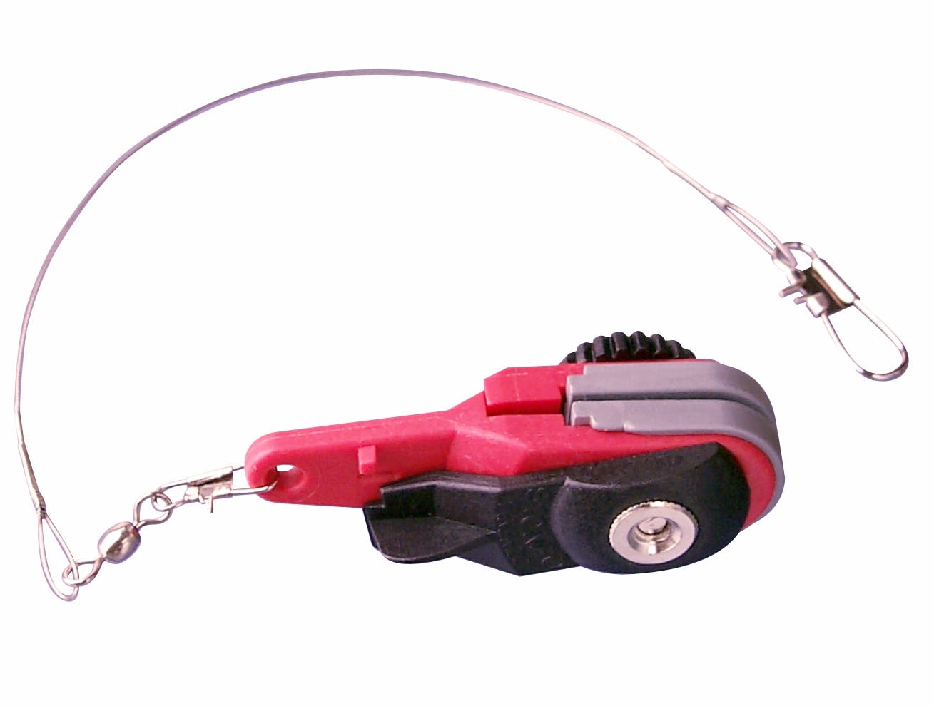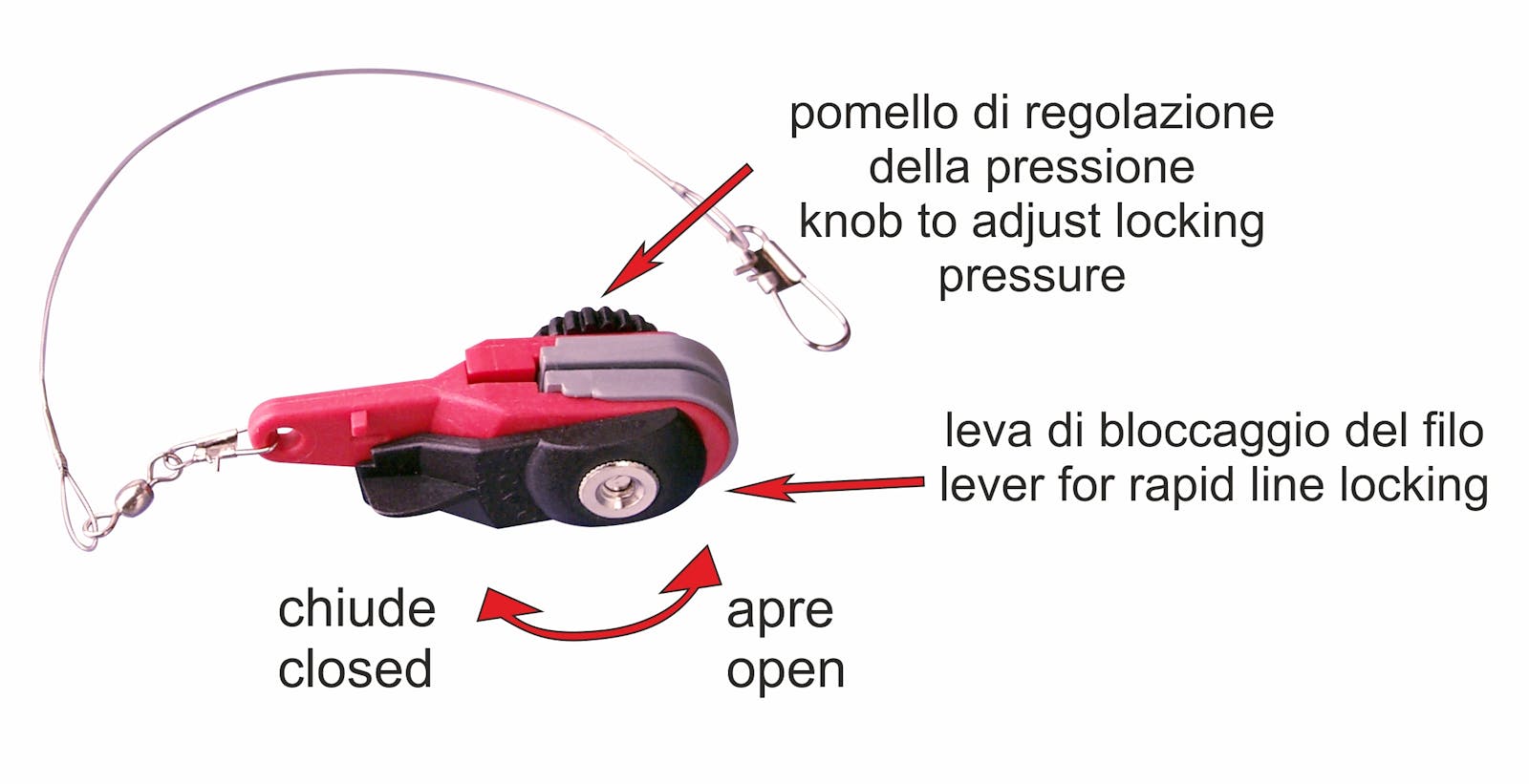 Clip release for downrigger fishing. Equipped with knob to adjust the locking pressure of the line and with a lever device for rapid line locking. Thanks to this lever you can open or close the jaws without adjust again the locking pressure. Patented.