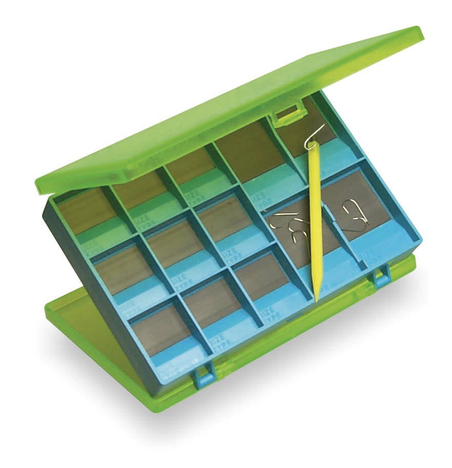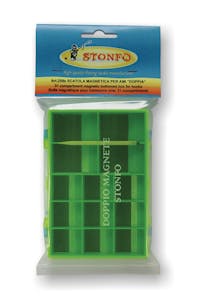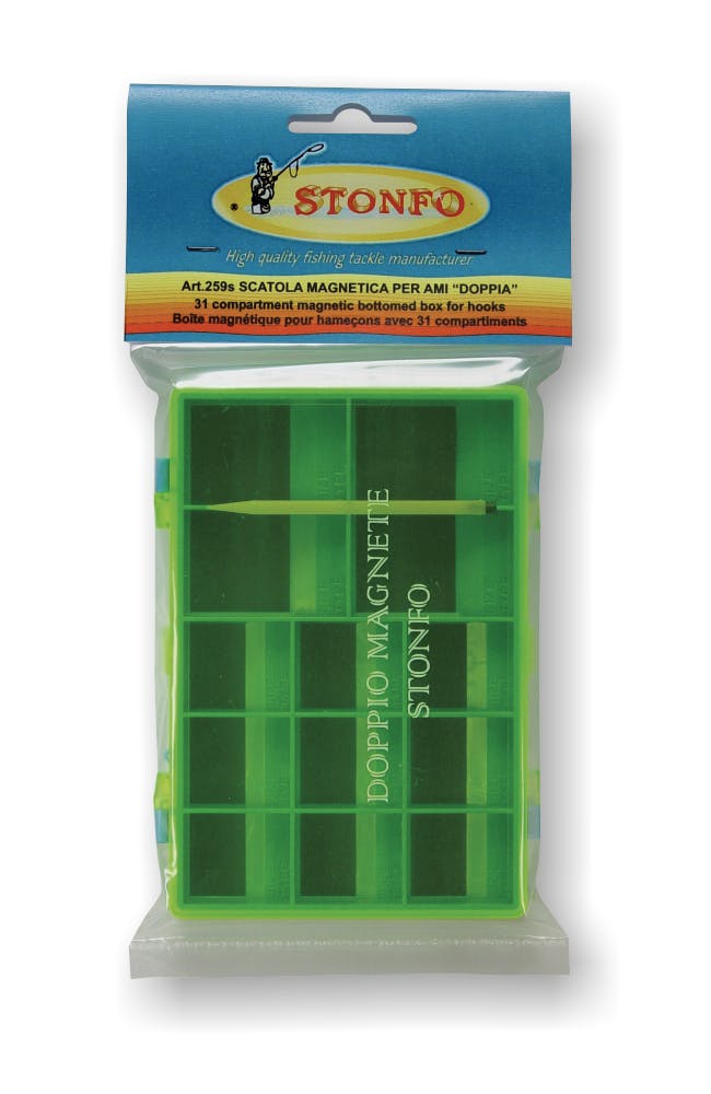 Double sided magnetic box with 31 compartments. Each compartment has an inclined plane to take hooks out of the box easily. Supplied with two magnetic pencils.