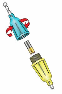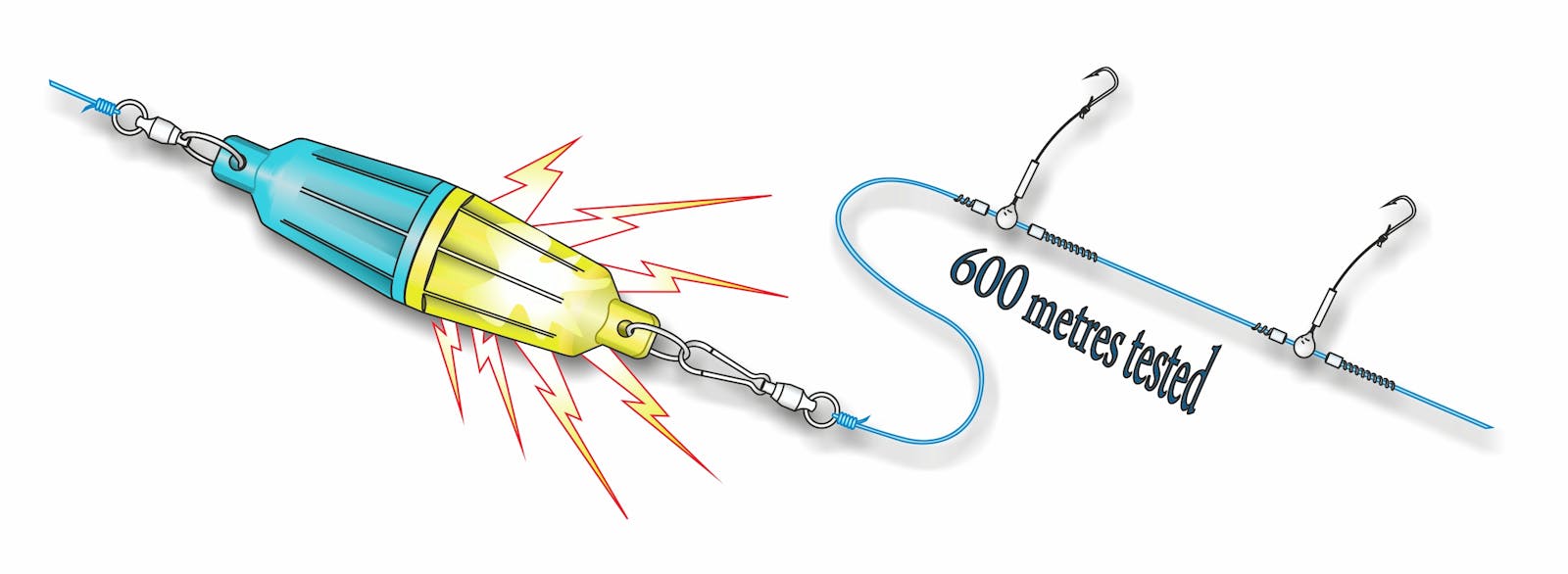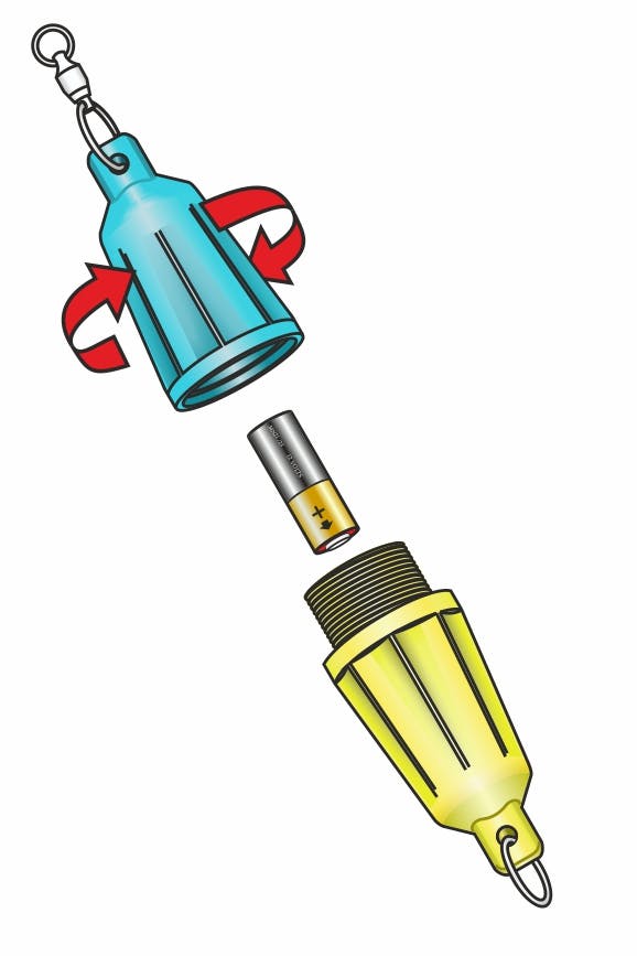 Flash lamp for deep fishing, drifting, trolling. Also useful for diving, camping, etc. Available in white and phosphorescent colours. Two batteries included.