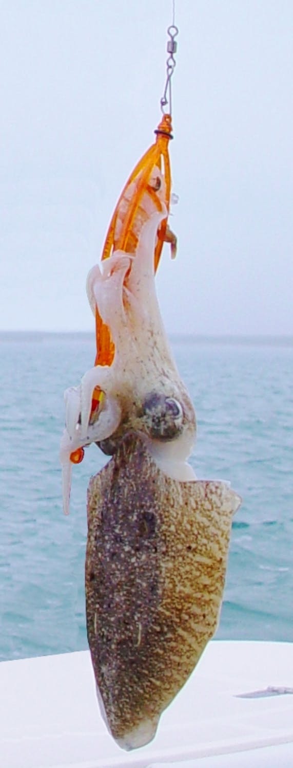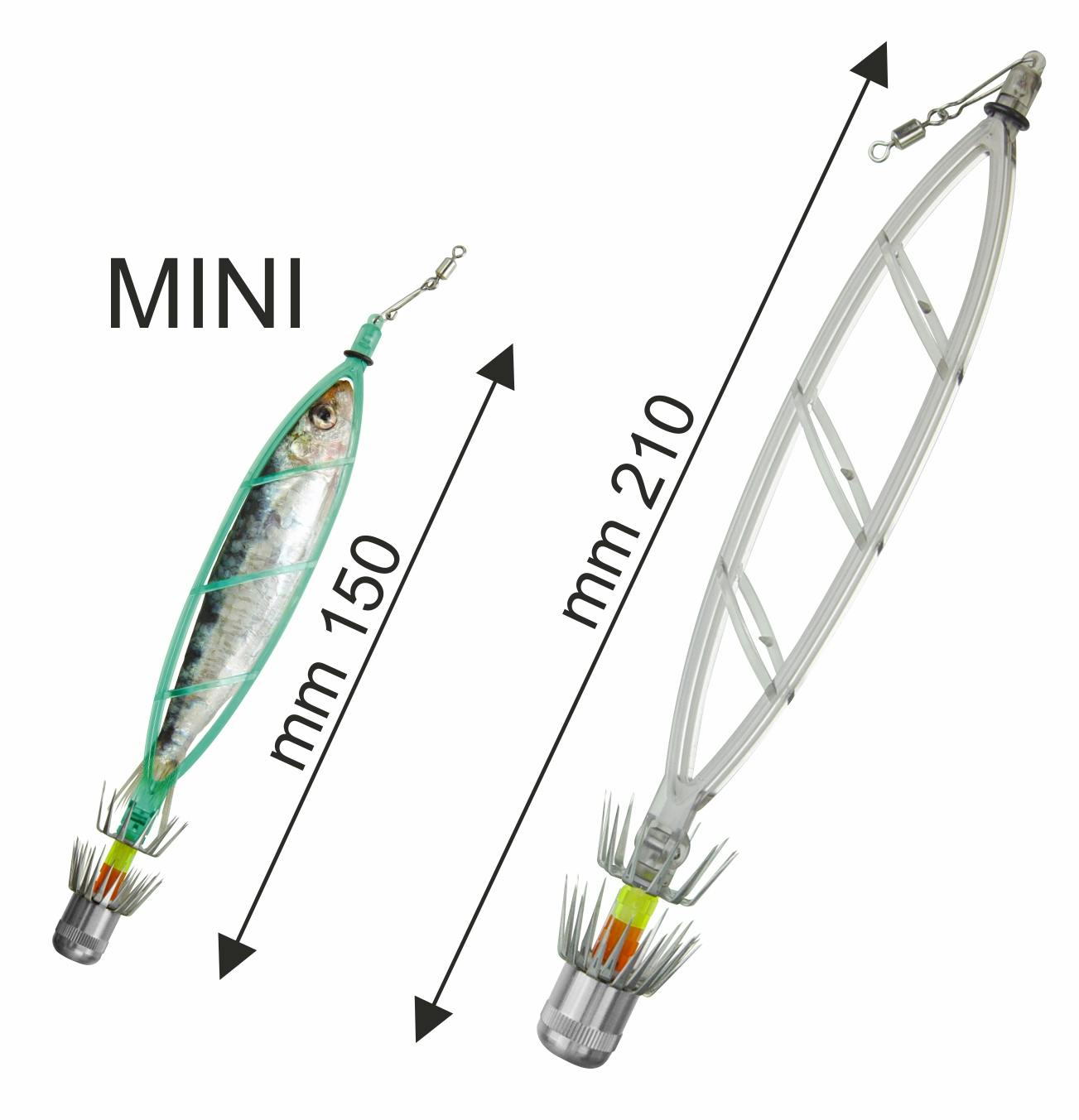 Squid lure with special plastic colored clear frame. Allows to lock the fish bait easily. Available in 2 different sizes and with fixed or interchangeable weights.Miscellaneous colors.