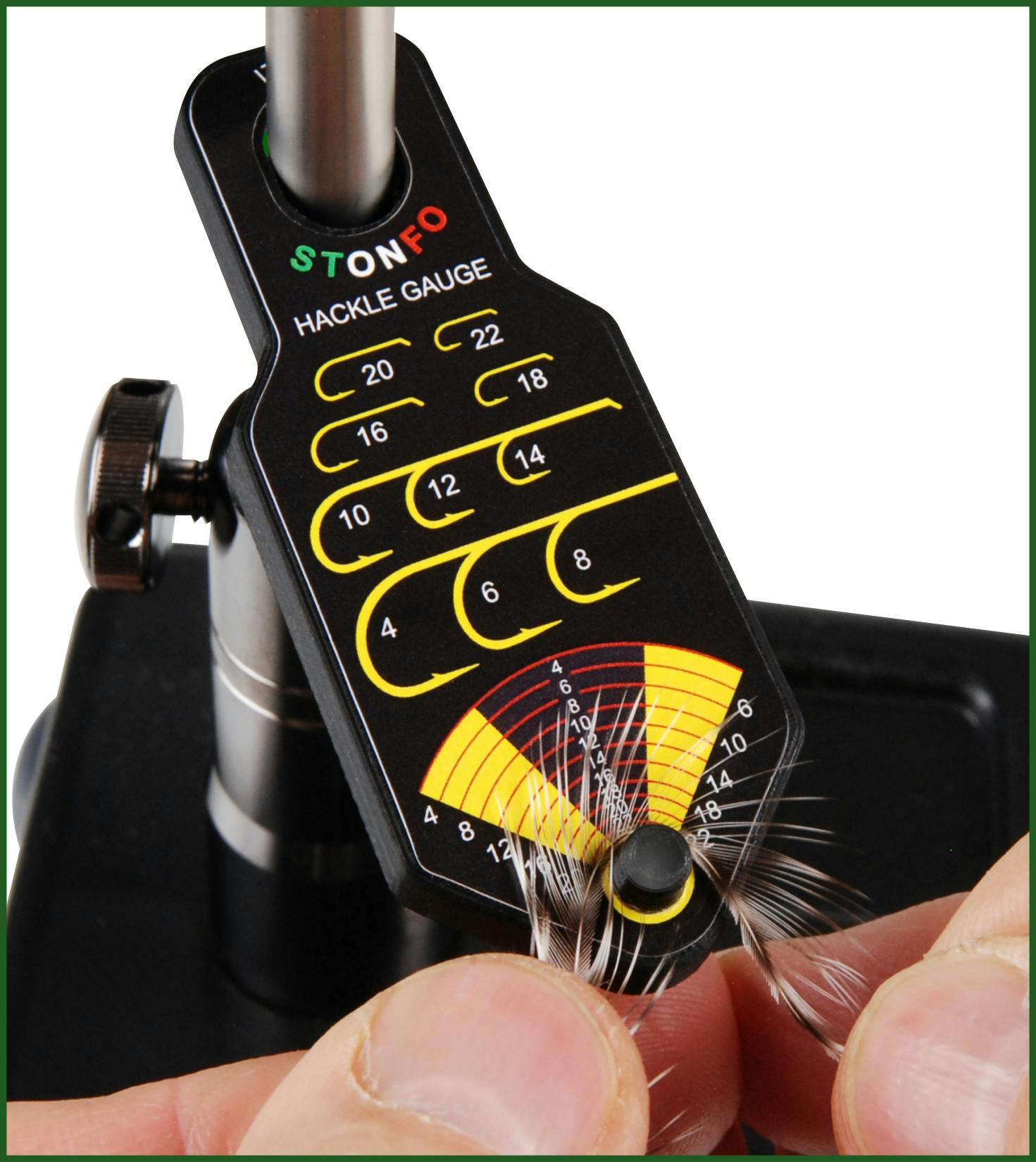 The Hackle Gauge helps to choose the hackle or hook size quickly and easily. Just bend an hackle around the plastic pin and read the appropriate hook size on the curved scale. The graphic clearly indicates the sizes of the hooks from 4 to 22 and the colors of the curved scale allow a good view with both light and dark hackles. It can be applied directly to the vise stem and can be rotated when not in use.