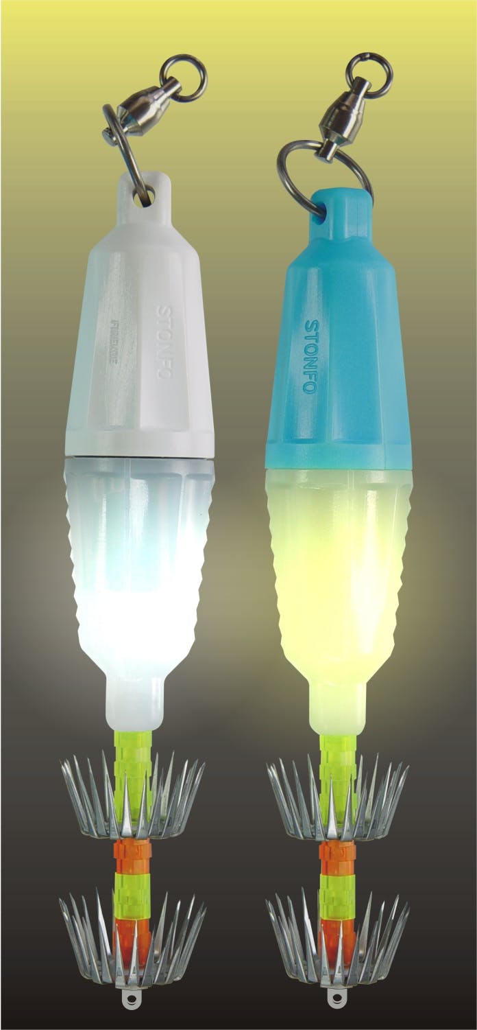 Luminous intermittent flash lures for squid fishing. Equipped with special patented squid hooks. Battery included 12 volt alkaline mod.A23.