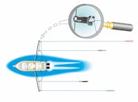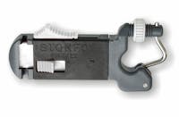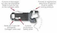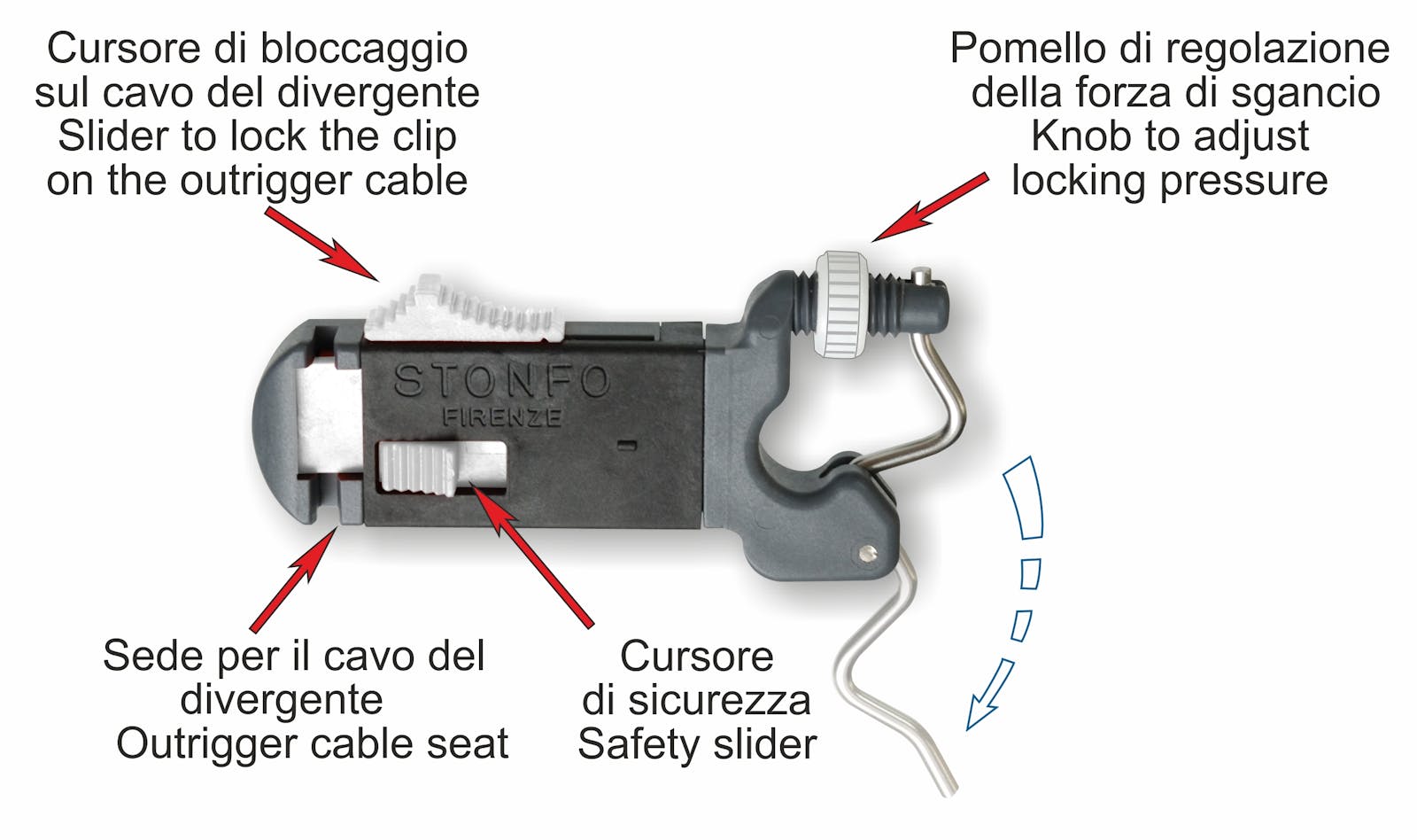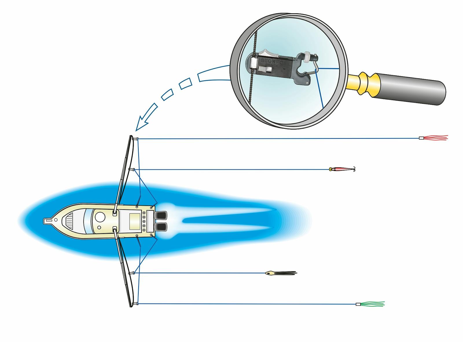 Release clip for fishing line with precise tension setting system. The special device for the locking on the outrigger cable allows the employment of more than one clip on the same outrigger. Patented.
