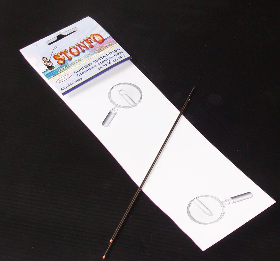 Stainless steel peanut worm needle with line threading ring. The highly visible fluo colour of the plastic point and its ogival shape allow an easy threading of the worm without any deviation.