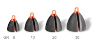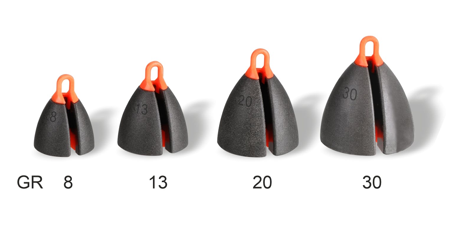 Plummets with central and direct line passage, they allow an accurate depth reading. The hook must be inserted inside the upper loop and following the side groove must then be fixed to the rubber at the base of the plummet. The line and the hook will thus be well centered and protected inside the plummet. The plastic loop, does not damage the line. The shape with a wide base makes the perception of the bottom easier. Made of non-toxic material.