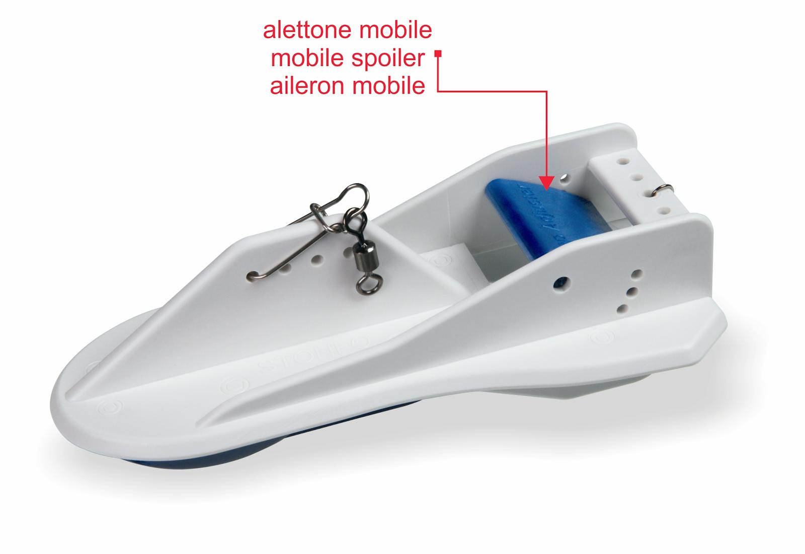 Hydrodynamic diver with mobile spoiler for depth adjustment. Ideal for light trolling. Trolling speed from 1 to 7 knots. In case of bite returns to the surface making easy the catch of the fish.