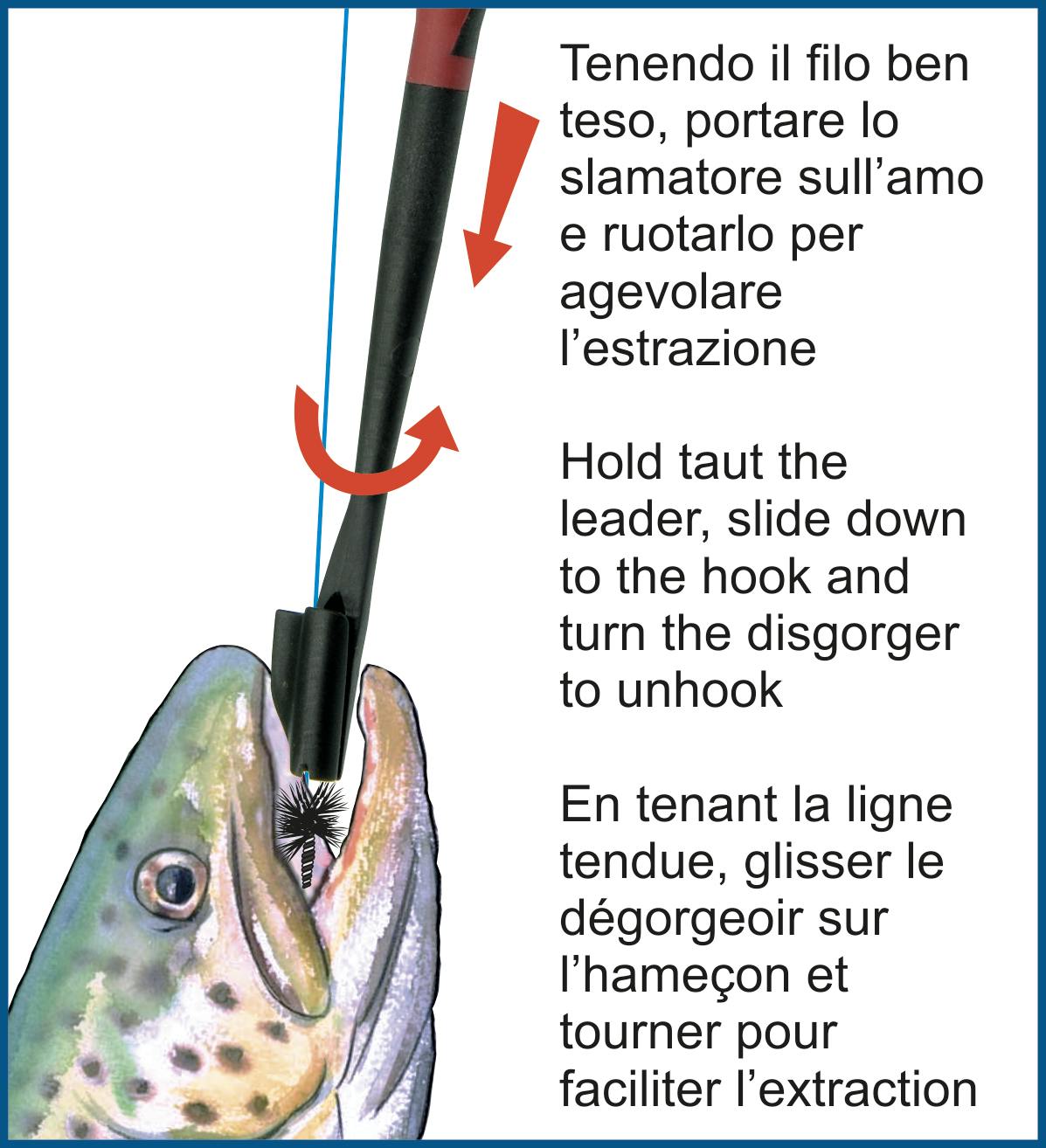 High quality disgorger with shaped tubular head, designed for a quick hook release without damaging fly or fish. Produced with very strong material and with anatomic rubber handle. Fantastic for every kind of fishing it is indispensable for the catch and release. Equipped with eyelet to hang it on a tool holder.