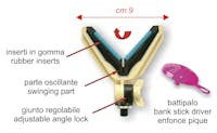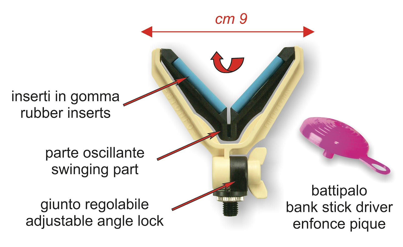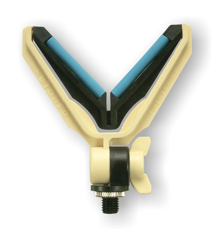 Appoggiacanna in materiale plastico resistentissimo con forcella a V basculante per avere sempre una corretta posizione rispetto alla canna. Munito di inserti in gomma per non danneggiare la canna. Attacco a vite con ghieretta regolabile. Fornito con Battipalo omaggio.