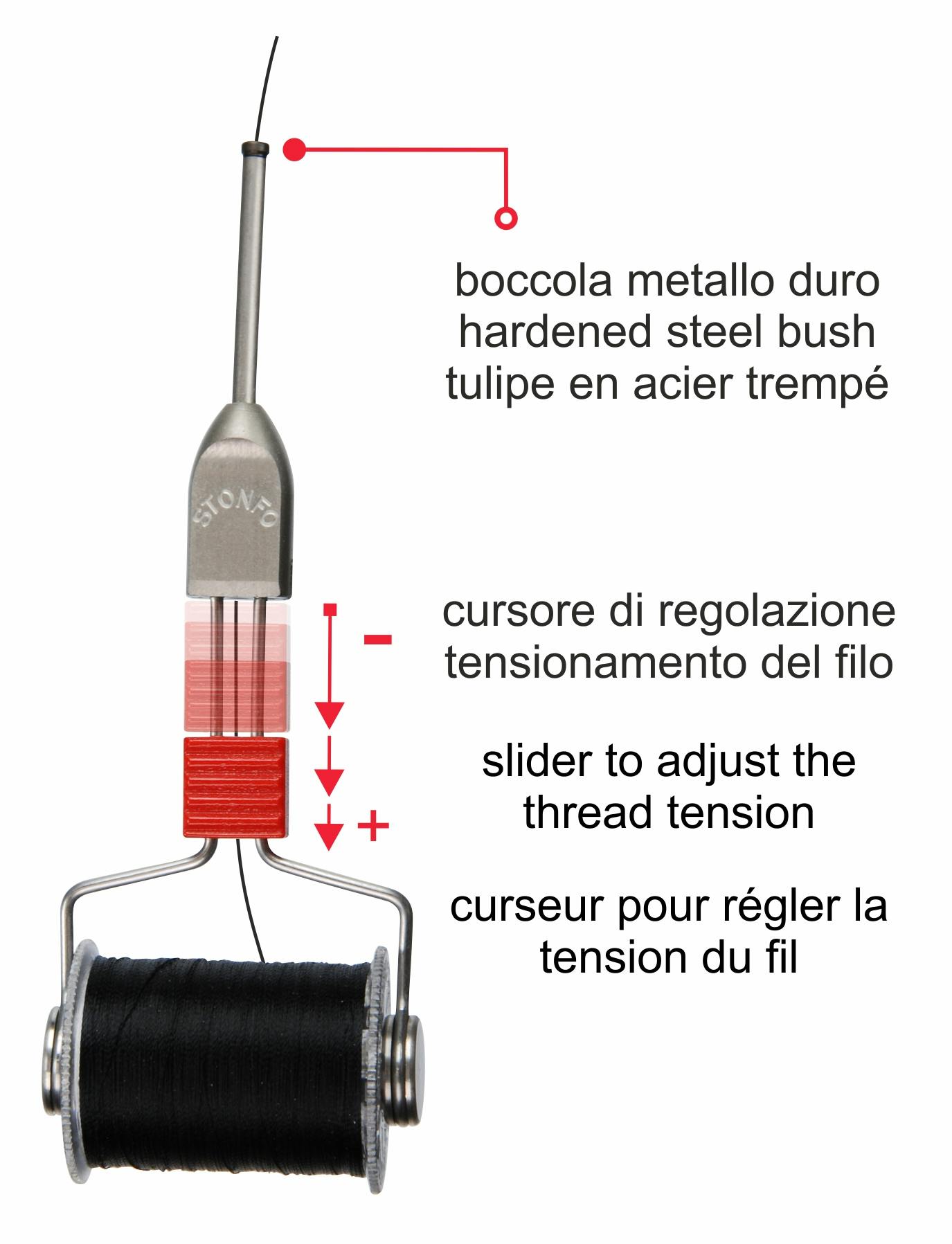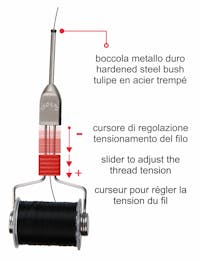 Bobinatore in acciaio inox con tubetto di diametro maggiorato indicato per filati di grande spessore. Il tensionamento del filo è regolabile tramite cursore. Permette un cambio rapido della bobina. Il tubetto scorrifilo ha alla sua estremità una boccola in acciaio temprato resistentissima all'usura e agli urti. Perfettamente bilanciato per la rotazione è ideale nella realizzazione di dubbing in asola creata dividendo il filo.