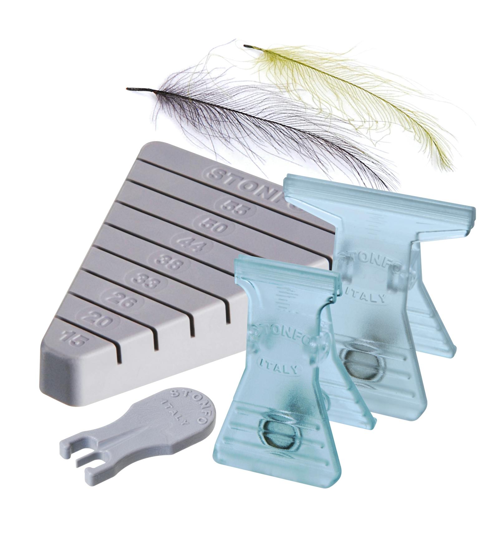 - Un blocchetto con intagli di differente lunghezza per piegare agevolmente le piume.