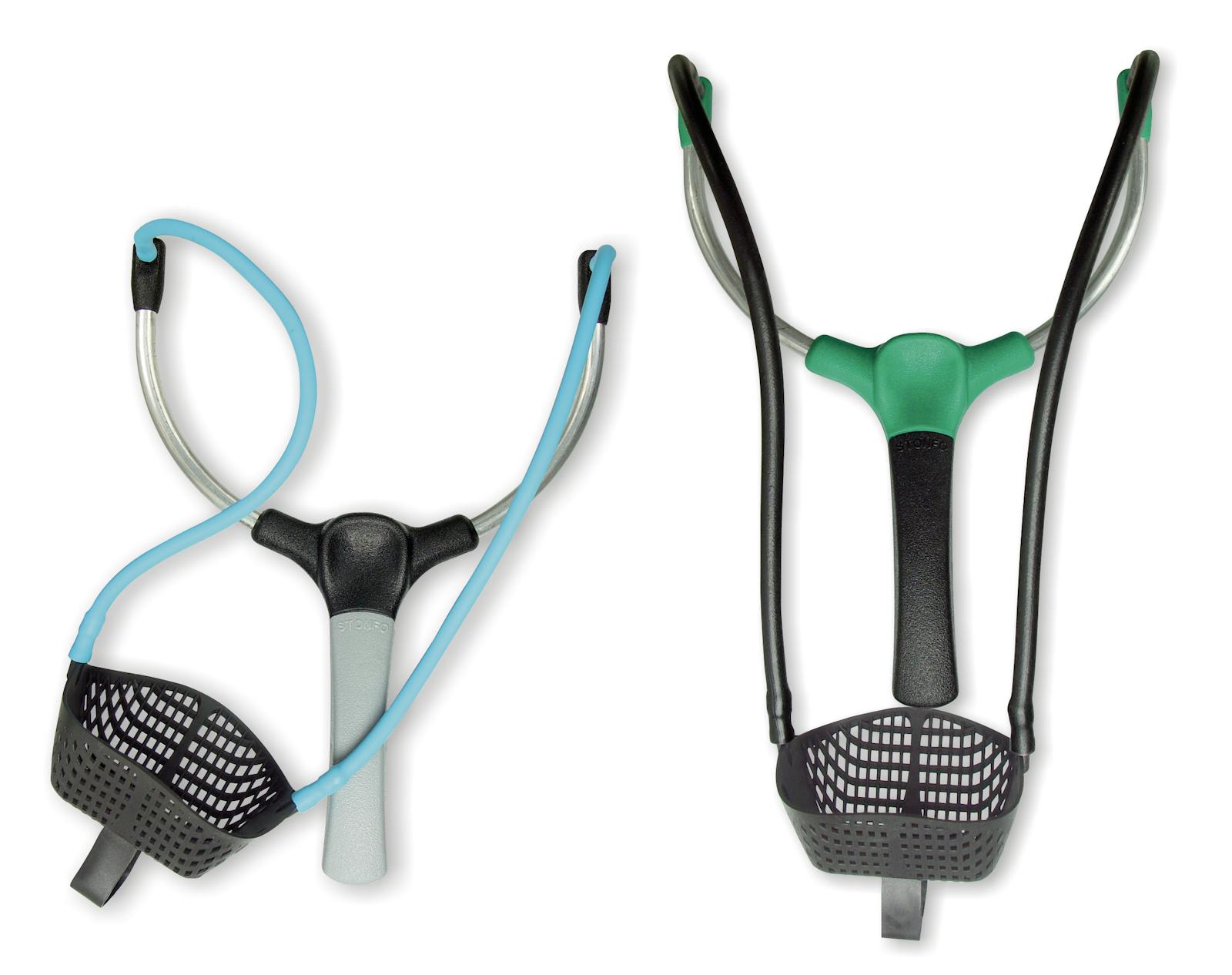 Forcelle in alluminio con impugnatura in plastica anatomica e bicchierino in gomma morbida per pastura. Munite di elastici di notevole potenza sono state studiate per il lancio di pastura a grandissima distanza.