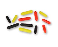 Tappini in gomma elastica leggerissima di colore fluorescente. Inseriti sull'antenna del galleggiante ne migliorano notevolmente la visibilità. Non variano la portata del galleggiante. Busta assortita con 3 colori e due misure che si adattano su antenne da Ø mm 1,0 a 2,5.