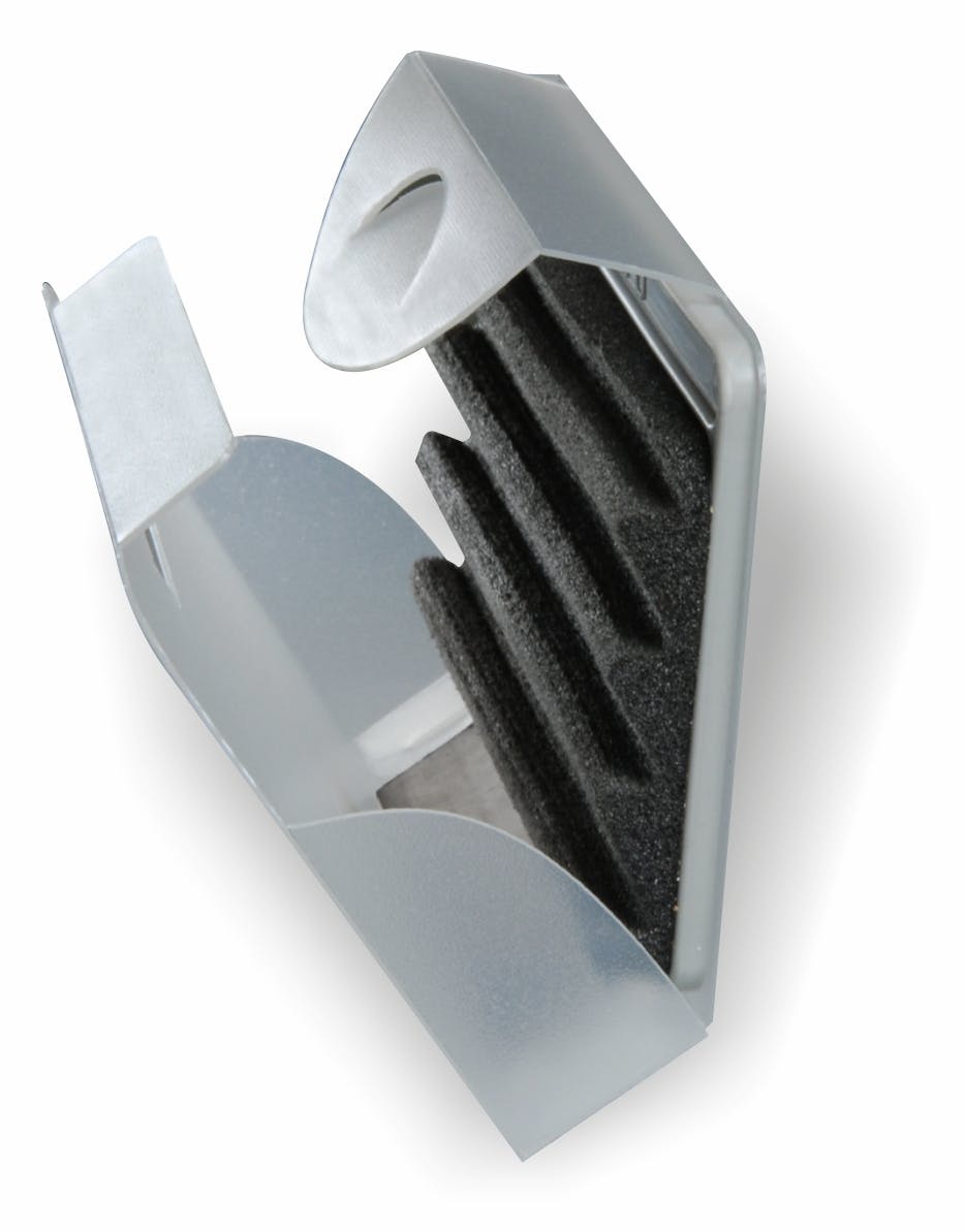 Placchetta appendi mosche in gomma ondulata espansa ad alta densità con copertura di protezione trasparente in polipropilene. Il fondo di questa struttura scatolare è magnetico e chiuso ai lati per evitare la perdita di mosche. Di pratico utilizzo si fissa al gilet per mezzo di una spilla di sicurezza. Dim. mm 85X60.