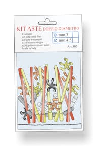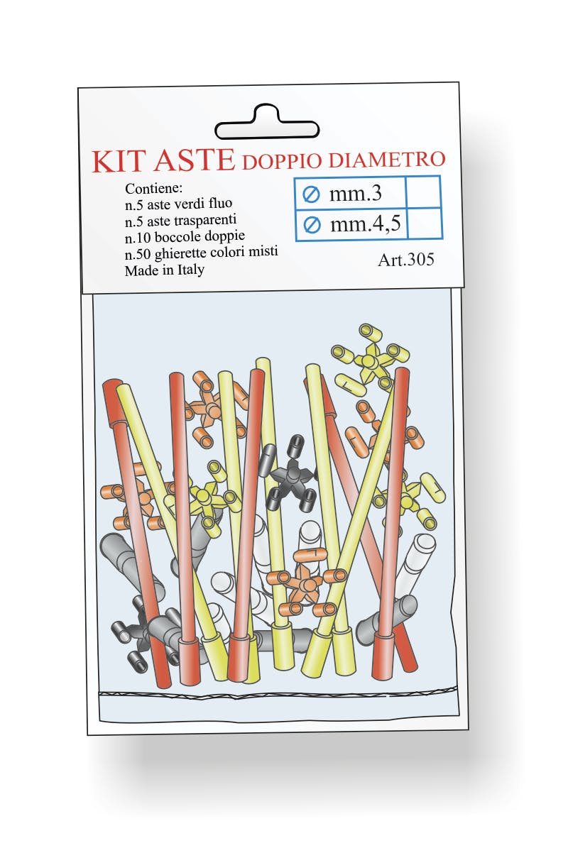 Contiene 10 aste doppio diametro vari colori, 10 boccole doppie, 50 ghierette vari colori.