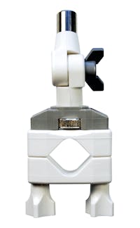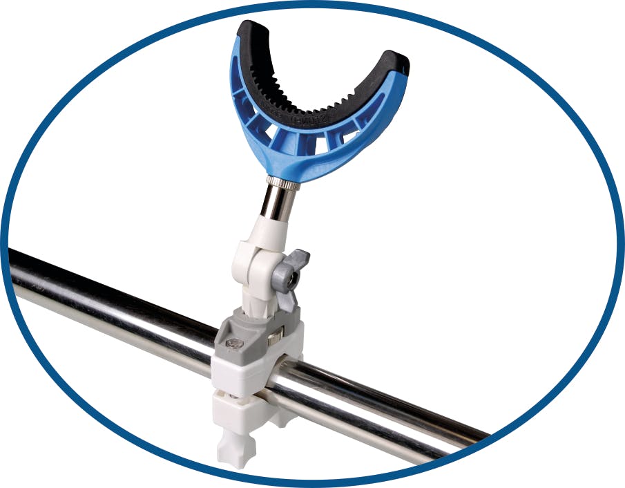 Morsetto completo di giunto regolabile con vite di attacco universale (3/8"x20). Permette il bloccaggio di appoggiacanne, serbidora od altri accessori su pali di sezione circolare o quadra.