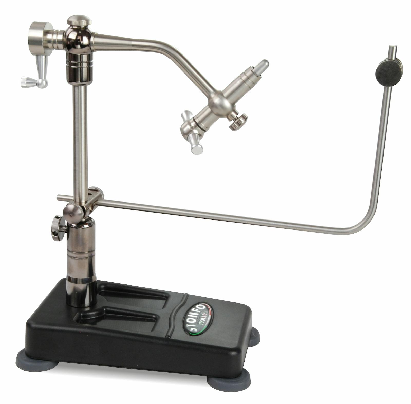 Morsetto rotante in asse a 360° di alta qualità per la costruzione di mosche ed esche artificiali con albero porta testa in acciaio inox supportato da due cuscinetti a sfera di precisione. Frizione regolabile sul movimento di rotazione. Bloccaggio testa 0°. Leggero e poco ingombrante. Fornito completo di base con nicchie, 3 pinze intercambiabili in acciaio temprato, supporto bobinatore e parachute, centratore, spirale di bloccaggio, chiave a brugola e istruzioni d’uso.