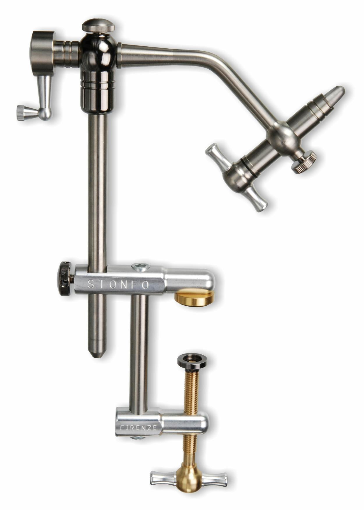 Morsetto rotante in asse a 360° di alta qualità per la costruzione di mosche ed esche artificiali con albero porta testa in acciaio inox supportato da due cuscinetti a sfera di precisione. Frizione regolabile sul movimento di rotazione. Bloccaggio testa 0°. Leggero e poco ingombrante. Fornito completo di C Clamp ( per fissaggio su tavola con piano fino a 50 mm di spessore ), 3 pinze intercambiabili in acciaio temprato, supporto bobinatore e parachute, centratore, spirale di bloccaggio, chiave a brugola e istruzioni per l’uso.