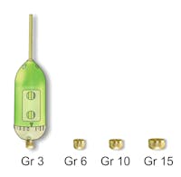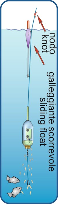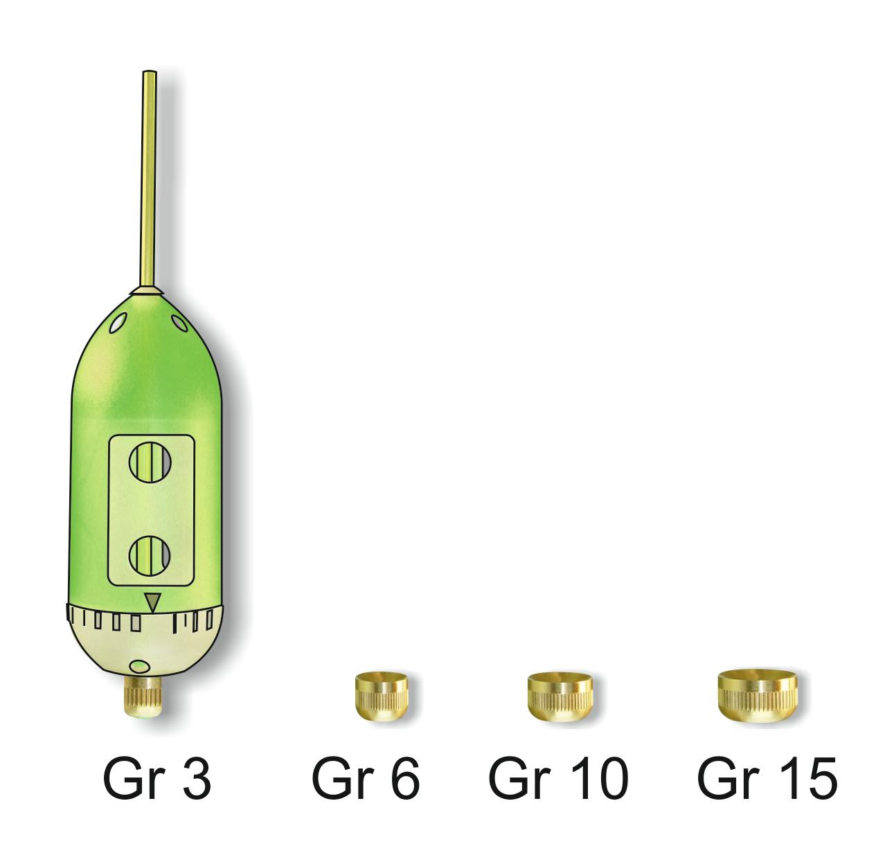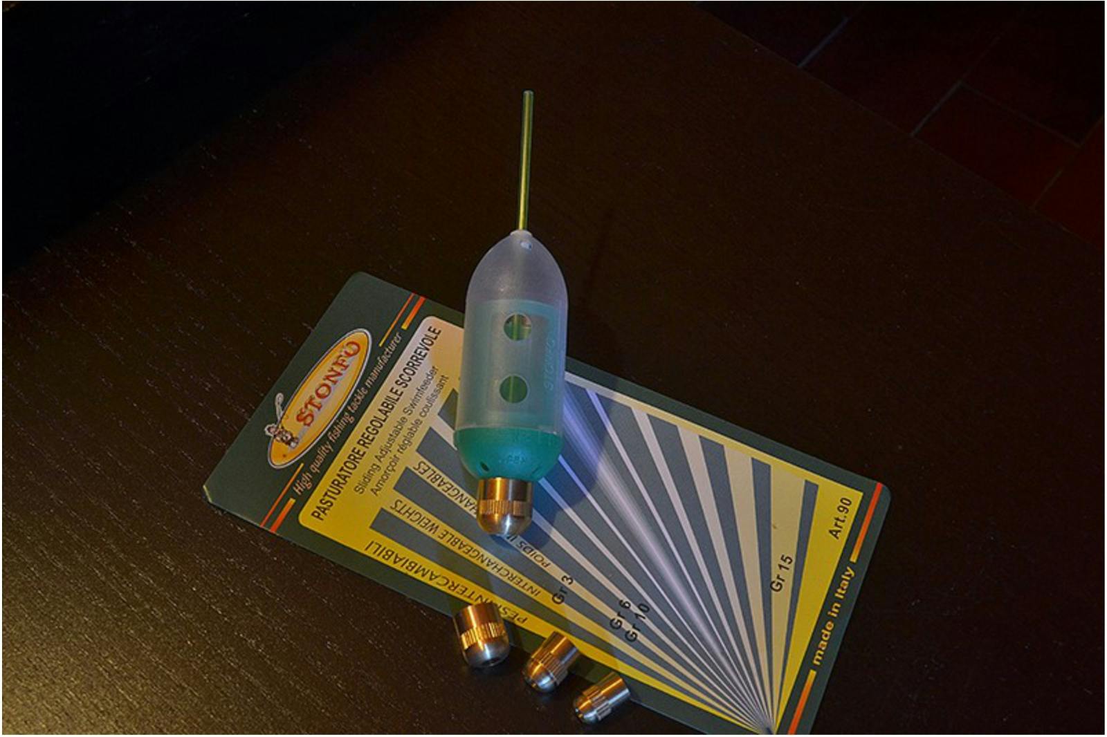 Pasturatore scorrevole con regolazione della grandezza dei fori consente di variare il flusso delle esche. Fornito con 4 pesi diversi intercambiabili rapidamente.