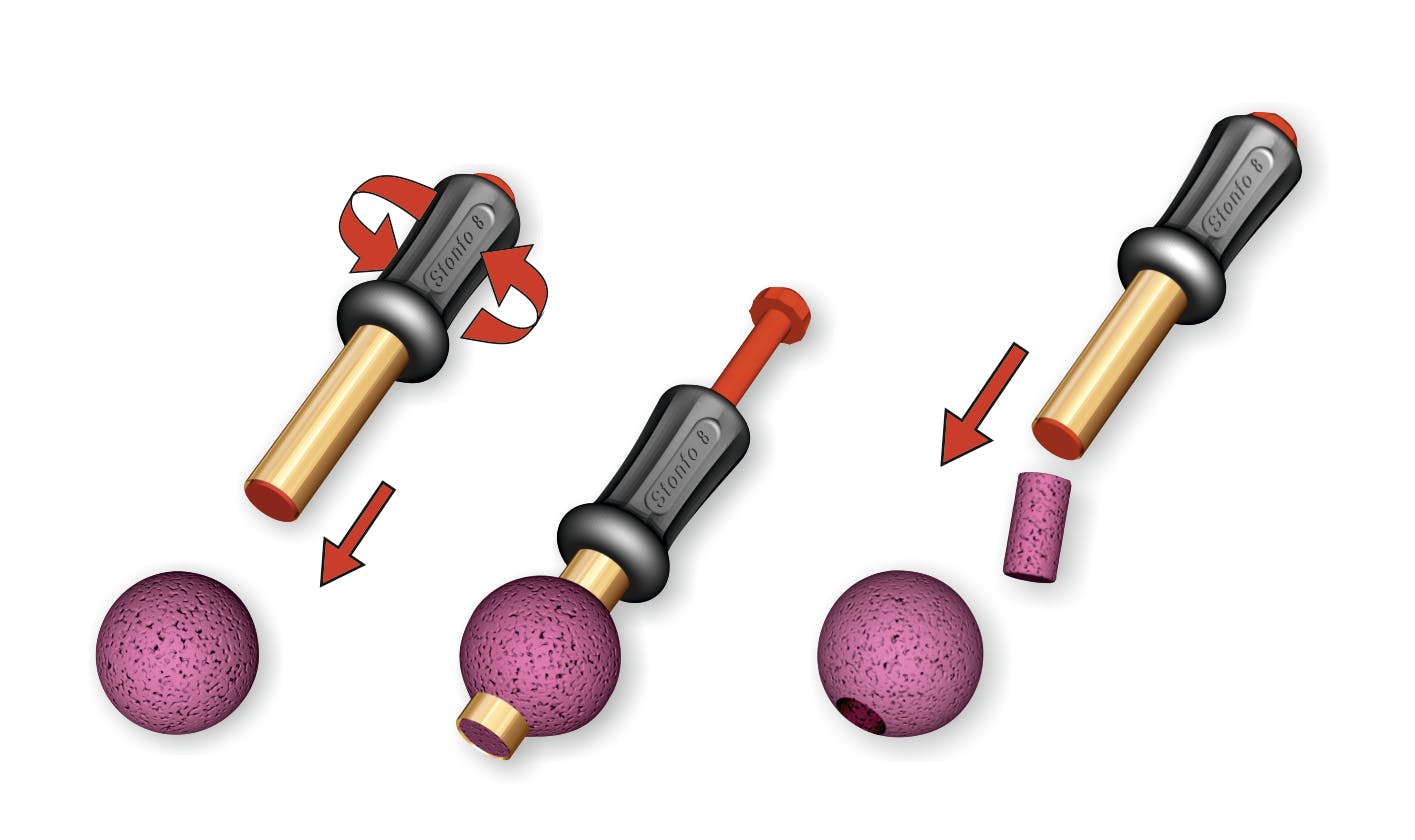 Punzoni foraboilies con impugnatura anatomica in gomma e tagliente in metallo. Muniti di pistoncino estrattore.