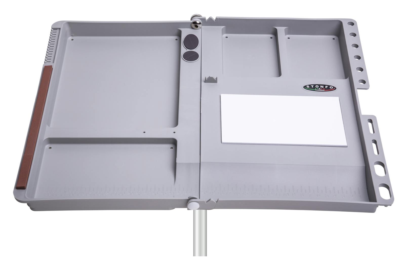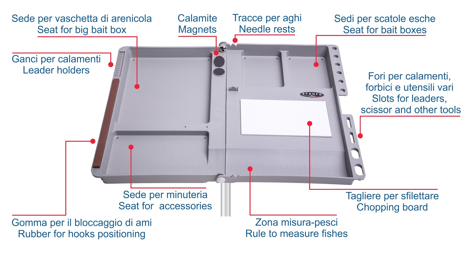 Serbidora ripiegabile e leggera progettata per venire incontro alle molteplici esigenze del pescatore. La sua struttura in materiale plastico resistentissimo è perfettamente smussata e priva di angoli taglienti. Le nicchie di cui è munita possono contenere varie vaschette porta-esche in posizione perfettamente stabile. Altre caratteristiche importanti fanno di questa serbidora un vero e proprio completo banco di lavoro. Attacco a vite metallica universale per paletto posto centralmente. Massima leggerezza gr 700. Dimensioni cm 45x36. Minimo ingombro da chiusa cm 36x26.