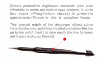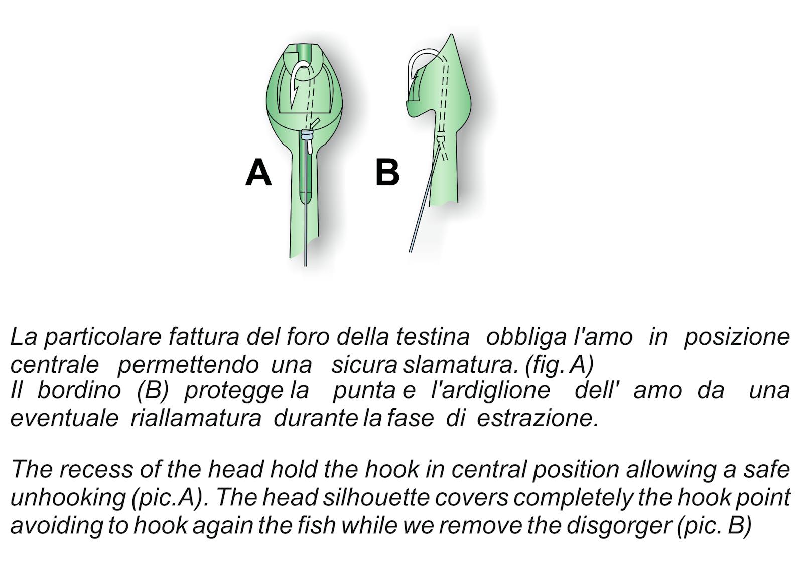 La silouette a cuneo delle testine permette di slamare anche i pesci che tengono la bocca tenacemente chiusa, inoltre il taglio obliquo in linea con la sagoma delle testine permette una rapida presa del filo anche in totale assenza di luce.