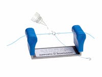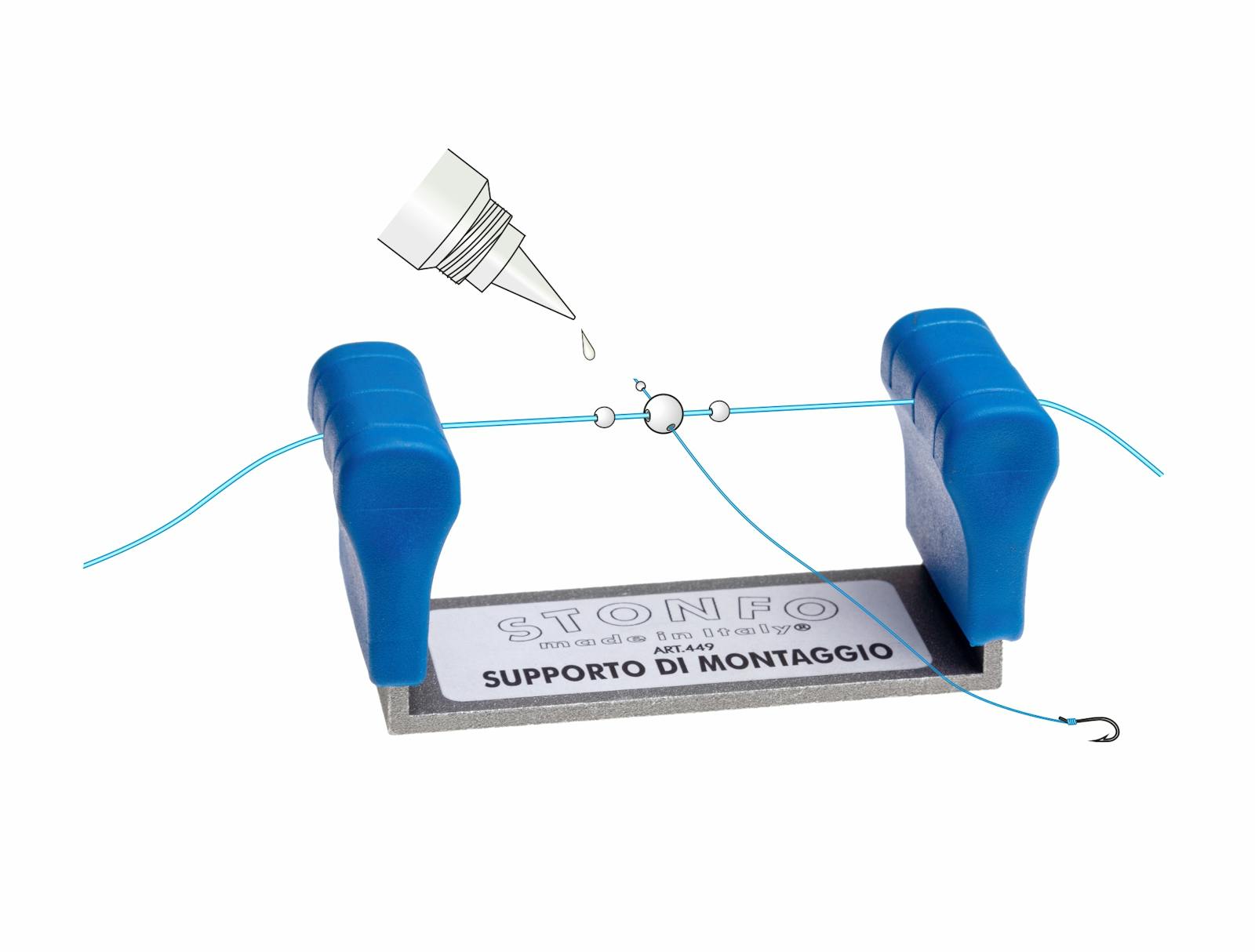 Supporto per sostenere il filo (nylon o trecciato) durante le operazioni di montaggio del terminale. Composto da una basetta in alluminio che lo rende stabile e da inserti in gomma blocca-filo.