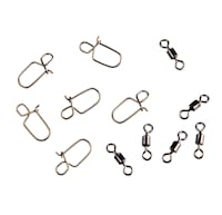Moschettoni in acciaio inox ideali per la pesca a tataki. La loro forma arrotondata permette la massima libertà di movimento all’esca artificiale. Forniti completi di girelle.