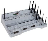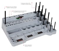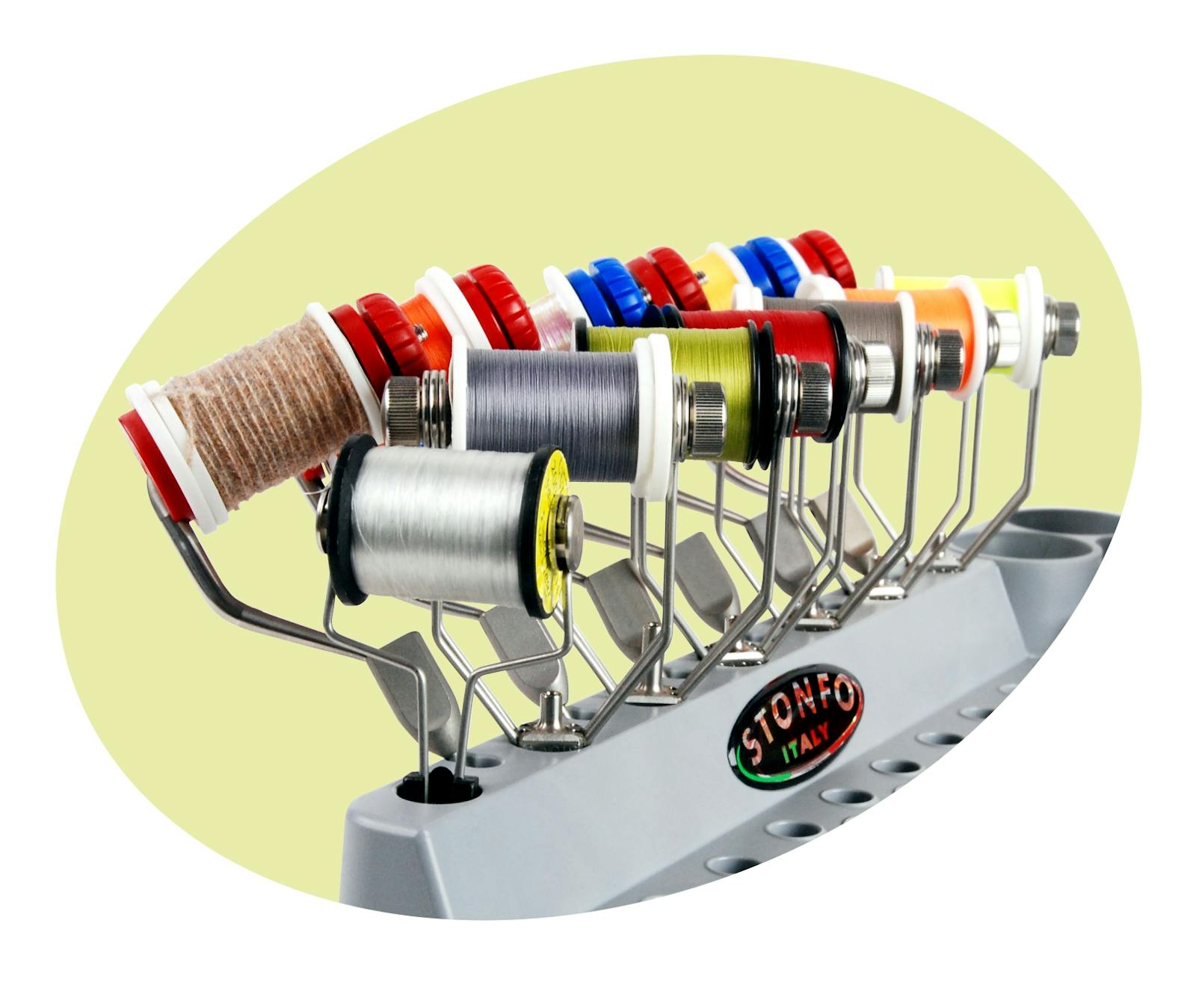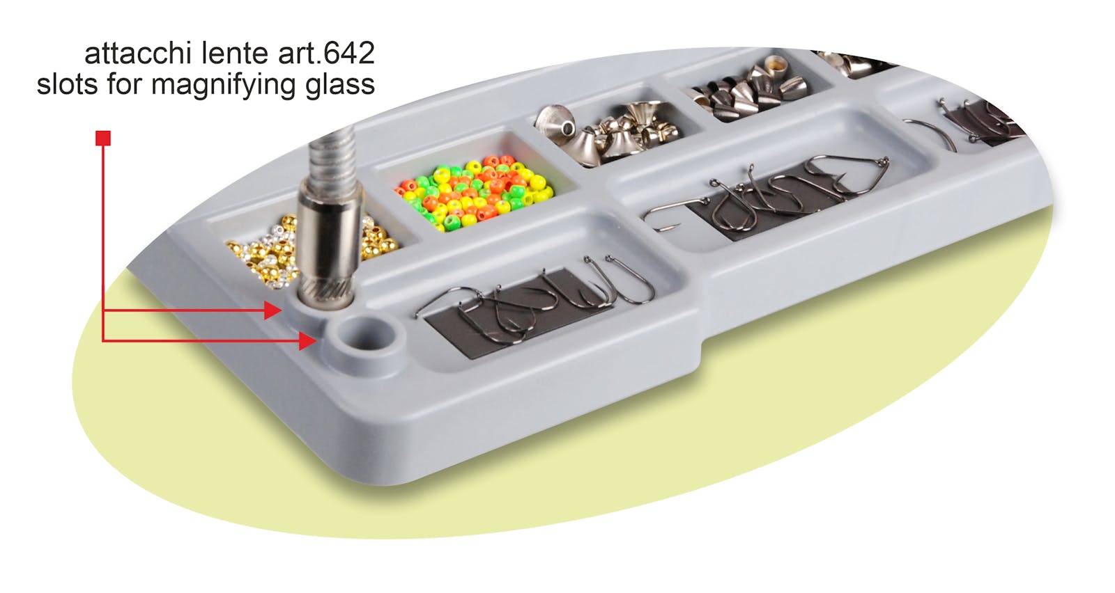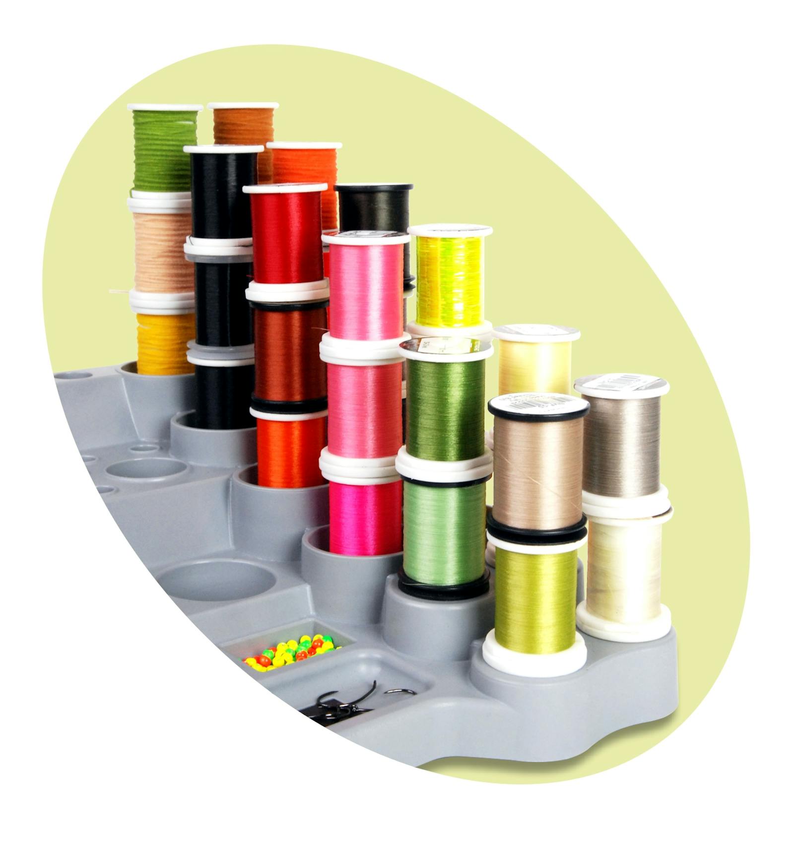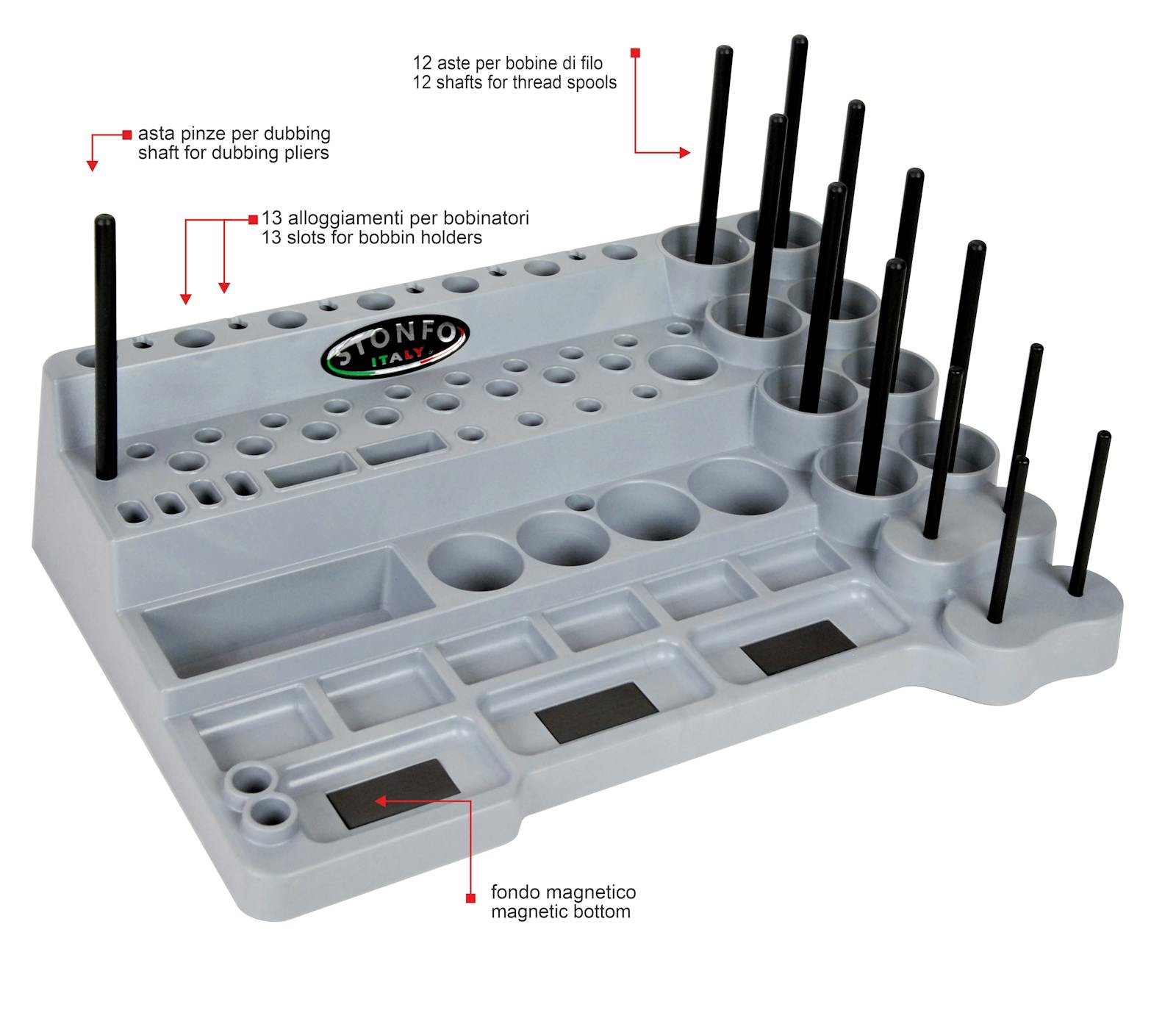 Porta utensili con molteplici alloggiamenti, tasche e fori per tenere in modo ordinato ed a portata di mano tutto ciò che occorre per il costruttore di mosche. In totale il Tool Station ha 13 alloggiamenti per bobinatori, 12 aste per riporre 32 bobine di filo, 23 fori per il posizionamento di utensili vari, 6 alloggiamenti per forbici e taglierini, 5 alloggiamenti per boccettine di colla vernice etc, 7 tasche rettangolari di varie dimensioni per contenere accessori vari, 3 tasche con fondo magnetico per riporre mosche ed ami, 1 asta porta pinze per dubbing, 2 fori per il fissaggio della lente d’ingrandimento. Prodotto in materiale molto resistente. Munito di quattro piedini in gomma antiscivolo.